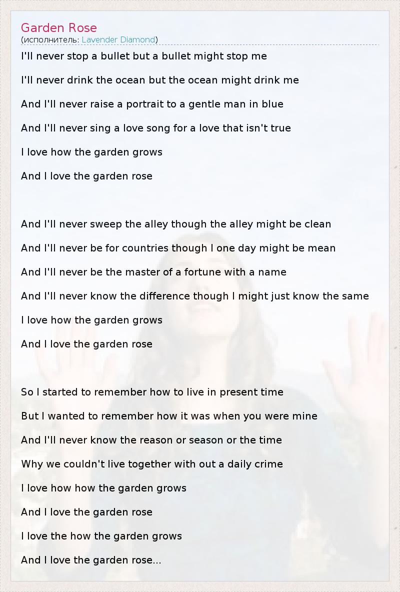 I'll never stop a bullet but a bullet might stop me I'll never drink the ocean but the ocean might drink me And I'll never raise a portrait to a gentle man in blue And I'll never sing a love song for a love that isn't true I love how the garden grows And I love the garden rose And I'll never sweep the alley though the alley might be clean And I'll never be for countries though I one day might be mean And I'll never be the master of a fortune with a name And I'll never know the difference though I might just know the same I love how the garden grows And I love the garden rose So I started to remember how to live in present time But I wanted to remember how it was when you were mine And I'll never know the reason or season or the time Why we couldn't live together with out a daily crime I love how how the garden grows And I love the garden rose I love the how the garden grows And I love the garden rose...