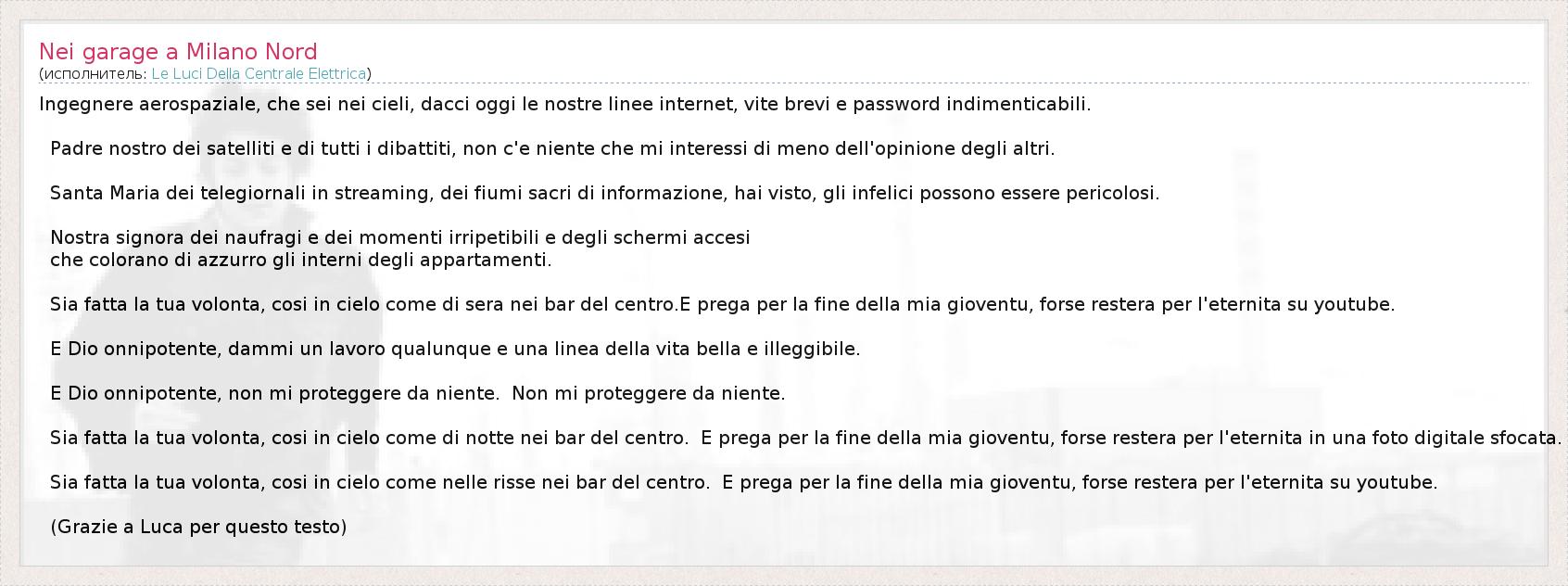 А как ты думаешь, о чем песня "Nei garage a Milano Nord" ?