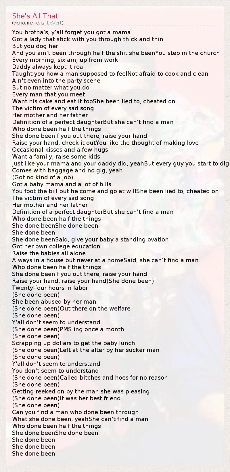 You brotha's, y'all forget you got a mama Got a lady that stick with you through thick and thin But you dog her And you ain't been through half the shit she beenYou step in the church Every morning, six am, up from work Daddy always kept it real Taught you how a man supposed to feelNot afraid to cook and clean Ain't even into the party scene But no matter what you do Every man that you meet Want his cake and eat it tooShe been lied to, cheated on The victim of every sad song Her mother and her father Definition of a perfect daughterBut she can't find a man Who done been half the things She done beenIf you out there, raise your hand Raise your hand, check it outYou like the thought of making love Occasional kisses and a few hugs Want a family, raise some kids Just like your mama and your daddy did, yeahBut every guy you start to dig Comes with baggage and no gig, yeah (Got no kind of a job) Got a baby mama and a lot of bills You foot the bill but he come and go at willShe been lied to, cheated on The victim of every sad song Her mother and her father Definition of a perfect daughterBut she can't find a man Who done been half the things She done beenShe done been She done been She done beenSaid, give your baby a standing ovation Got her own college education Raise the babies all alone Always in a house but never at a homeSaid, she can't find a man Who done been half the things She done beenIf you out there, raise your hand Raise your hand, raise your hand(She done been) Twenty-four hours in labor (She done been) She been abused by her man (She done been)Out there on the welfare (She done been) Y'all don't seem to understand (She done been)PMS ing once a month (She done been) Scrapping up dollars to get the baby lunch (She done been)Left at the alter by her sucker man (She done been) Y'all don't seem to understand You don't seem to understand (She done been)Called bitches and hoes for no reason (She done been) Getting reeked on by the man she was pleasing (She done been)It was her best friend (She done been) Can you find a man who done been through What she done been, yeahShe can't find a man Who done been half the things She done beenShe done been She done been She done been She done been