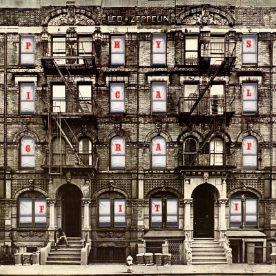 В 1975 год Led Zeppelin вступили самой популярной группой мира. Результаты продаж пластинок и билетов на концерты были настолько впечатляющи, что этот негласный титул даже никем не оспаривался! Годом ранее музыканты учредили собственный рекорд-лейбл "Swan Song", названный так по неизданной инструментальной композиции Джимми Пейджа. Первым релизом и стал двойной альбом отцов-основателей - "Physical Graffiti", вышедший 24 февраля 1975 г. (записывать его музыканты начали аж в ноябре 1973-го в поместье Хэдли Грейндж, в передвижной студии басиста "The Faces" Ронни Лейна). Предварительные заказы на эту пластинку составили сумму в 15 млн. долларов, так что не удивительно, что она моментально оказалась на 1-м месте хит-парада и стала четырежды "платиновой". Именно на "Physical Graffiti" можно найти "визитную карточку" группы - песню "Kashmir", где Джимми Пейдж демонстрирует мастерство игры на ситаре, "Houses of The Holy", так и не ставшую титульной композицией предыдущего альбома, и чартовый суперхит "Trampled Underfoot".