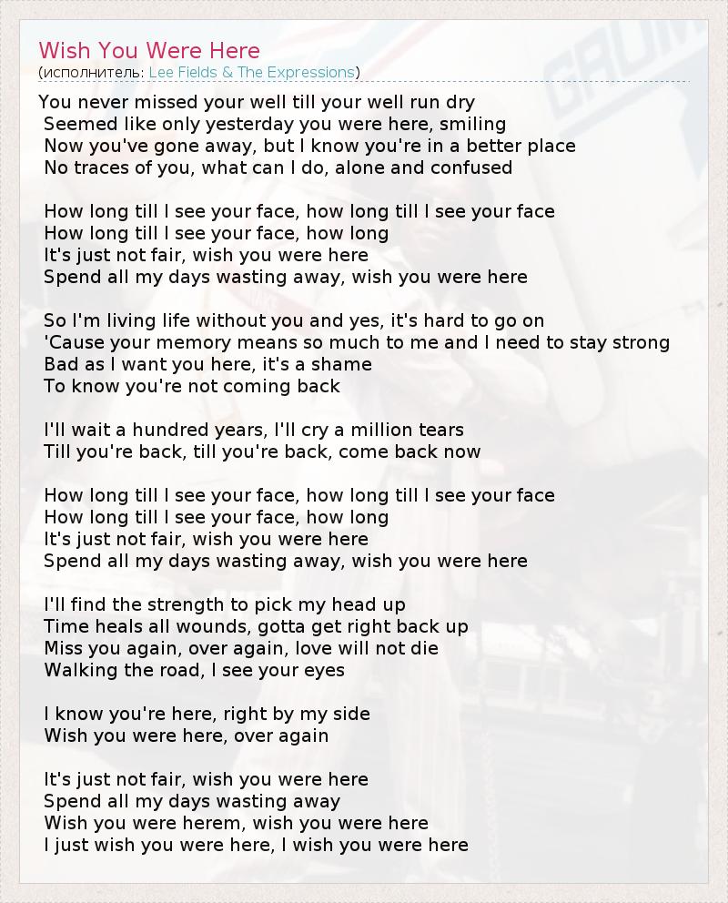 You never missed your well till your well run dry Seemed like only yesterday you were here, smiling Now you've gone away, but I know you're in a better place No traces of you, what can I do, alone and confused How long till I see your face, how long till I see your face How long till I see your face, how long It's just not fair, wish you were here Spend all my days wasting away, wish you were here So I'm living life without you and yes, it's hard to go on 'Cause your memory means so much to me and I need to stay strong Bad as I want you here, it's a shame To know you're not coming back I'll wait a hundred years, I'll cry a million tears Till you're back, till you're back, come back now How long till I see your face, how long till I see your face How long till I see your face, how long It's just not fair, wish you were here Spend all my days wasting away, wish you were here I'll find the strength to pick my head up Time heals all wounds, gotta get right back up Miss you again, over again, love will not die Walking the road, I see your eyes I know you're here, right by my side Wish you were here, over again It's just not fair, wish you were here Spend all my days wasting away Wish you were herem, wish you were here I just wish you were here, I wish you were here
