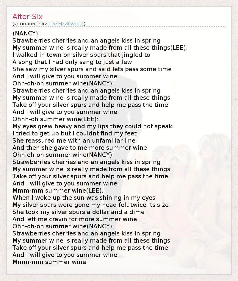 Это интересно:Ли Хезлвуд (англ. Lee Hazlewood, 9.07.1929 — 4.08.2007) — американский музыкант, автор песен, певец, продюсер. Ли Хезлвуд можно назвать одним из «серых кардиналов» современной музыки. Он, частично в соавторстве с Нэнси Синатрой (дочерью Фрэнка Синатры), написал такие хиты, как «This Boots Are Made For Walking», «Something Stupid», «Summer Wine», «Some Velvet Morning», на которые существует большое множество кавер-версий(Ник Кейв, Einstürzende... продолжение