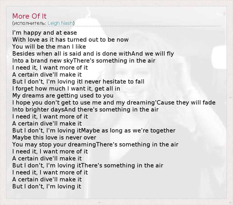 I'm happy and at ease With love as it has turned out to be now You will be the man I like Besides when all is said and is done withAnd we will fly Into a brand new skyThere's something in the air I need it, I want more of it A certain dive'll make it But I don't, I'm loving itI never hesitate to fall I forget how much I want it, get all in My dreams are getting used to you I hope you don't get to use me and my dreaming'Cause they will fade Into brighter daysAnd there's something in the air I need it, I want more of it A certain dive'll make it But I don't, I'm loving itMaybe as long as we're together Maybe this love is never over You may stop your dreamingThere's something in the air I need it, I want more of it A certain dive'll make it But I don't, I'm loving itThere's something in the air I need it, I want more of it A certain dive'll make it But I don't, I'm loving it