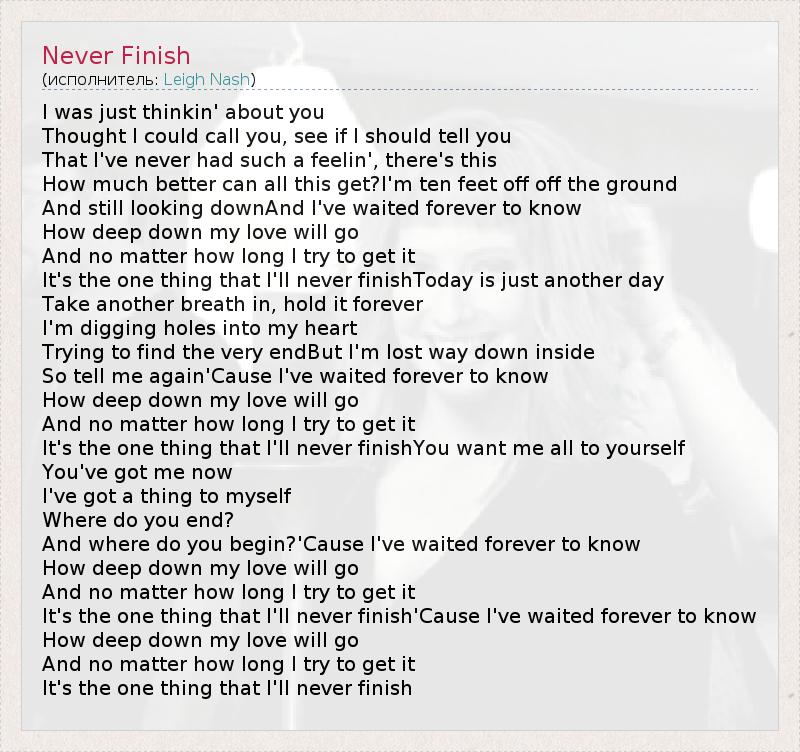 I was just thinkin' about you Thought I could call you, see if I should tell you That I've never had such a feelin', there's this How much better can all this get?I'm ten feet off off the ground And still looking downAnd I've waited forever to know How deep down my love will go And no matter how long I try to get it It's the one thing that I'll never finishToday is just another day Take another breath in, hold it forever I'm digging holes into my heart Trying to find the very endBut I'm lost way down inside So tell me again'Cause I've waited forever to know How deep down my love will go And no matter how long I try to get it It's the one thing that I'll never finishYou want me all to yourself You've got me now I've got a thing to myself Where do you end? And where do you begin?'Cause I've waited forever to know How deep down my love will go And no matter how long I try to get it It's the one thing that I'll never finish'Cause I've waited forever to know How deep down my love will go And no matter how long I try to get it It's the one thing that I'll never finish