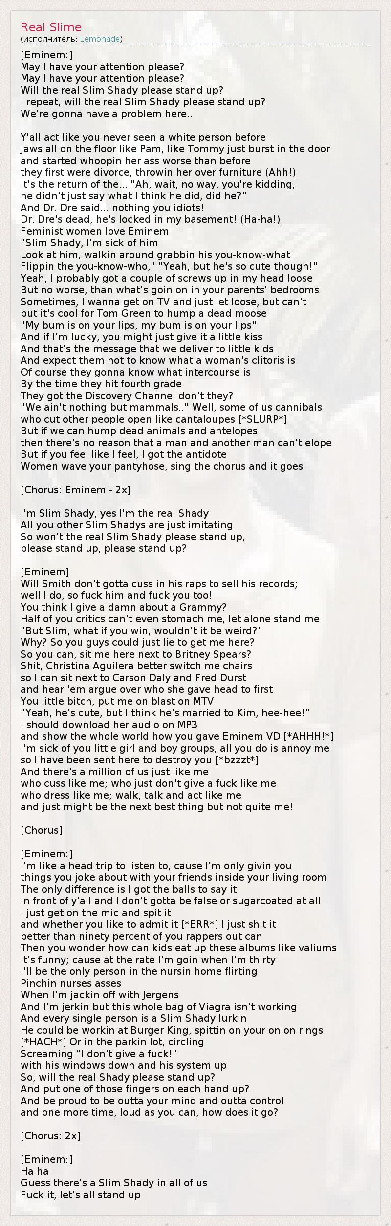 [Eminem:] Можно чуточку вашего внимания? Можно чуточку вашего внимания? Я прошу настоящего Слима Шейди встать. Повторяю, я прошу настоящего Слима Шейди встать. У нас есть одна проблема... Вы ведёте себя так, словно никогда не видели белого человека. Ваши челюсти отвисли до пола, как у Пэм, когда Томми вломился в дверь И начал расхваливать её зад**цу сильнее, чем обычно. Сначала они развелись: он бил её о мебель (Ах!). Это возвращение... "Подождите, не может быть, вы шутите, Он не произнёс того, что мне показалось, не правда ли?" А Доктор Дре сказал... Да ничего, вы, идиоты! Доктор Дре мёртв, он лежит у меня в подвале! (Ха-ха!) Феминистки обожают Эминема: "Слим Шейди, он безумно надоел мне. Посмотрите на него, он ходит туда-сюда, обхватив свой сами-знаете-что, Подбрасывая сами-знаете-кого". "Да, но он такой симпатичный!" Да, возможно, у меня с головой и, правда, не всё в порядке, Но это ничуть не хуже, чем то, что творится в спальне ваших предков. Иногда я хочу раскрепоститься прямо на телевидении, но не могу, Хотя Тому Грину безумно нравится тра**ть мёртвого лося. "Моя зад**ца на твоих губах, моя зад**ца на твоих губах", Если мне повезёт, ты её поцелуешь. Это послание, которое мы доносим до маленьких детей, И хотим после этого, чтобы они не знали, что такое клитор. Конечно, они узнают, что такое половое сношение Уже к четвёртому классу. Они же, наверняка, смотрят канал Дискавери. "Мы такие же млекопитающие...". Ну, некоторые из нас, вообще-то, каннибалы, Которые расчленяют людей, как мускусные дыни [Хлюп!]. Но если мы можем тра**ть мёртвых животных и антилоп, Почему тогда один мужчина не может сбежать с другим? А если вы чувствуете то же, что и я, то у меня есть решение – Женщины, снимите колготки, помашите ими, спойте припев, и всё получится. [Припев: Eminem - 2x] Я Слим Шейди, да, я настоящий Слим Шейди, А вы все, другие Слимы Шейди, только повторение меня. Поэтому, я прошу настоящего Слима Шейди встать, Пожалуйста, пусть он сделает это! [Eminem:] Уиллу Смиту в песнях не нужно материться, чтобы его диски раскупались, А я ругаюсь, поэтому пошёл он, и идите вы тоже! Вы думаете, я мечтаю получить Грэмми? Половина из вас, критиков, не выносит меня, нет, даже не переваривает. "Но, Слим, а если ты выиграешь, не будет ли это странно?" Почему? Неужели вы просто не можете соврать, чтобы я победил? Вы ведь можете, и я сяду рядом с Бритни Спирс. Но нет, Кристина Агилера, давай мы с тобой лучше поменяемся стульями, Чтобы я сел рядом с Карсон Дэйли и Фредом Дурстом, И подслушал, как они спорят о том, кому она первым сделала минет. Ты, маленькая су**, доставь мне удовольствие побывать на MTV! "Да, он симпатичный, но я думаю, он женат на Ким, хи-хи!" Мне нужно загрузить её запись в формате MP3 И рассказать всему миру о том, как она одарила Эминема венерическим заболеванием. Меня тошнит от ваших девичьих и мальчишеских групп, вы меня только раздражаете, Поэтому меня послали сюда уничтожить вас. И таких, как я, миллионы, Которые матерятся, как я, которым на всё наплевать, Которые одеваются, как я, ходят, говорят и поступают, как я. И, возможно, они невероятно похожи на меня, но они не я! [Припев] [Eminem:] Меня слушать в наивысшей степени приятно, потому что я пою о том, О чём можно шутить с друзьями дома. Единственным отличием является то, что мне не слабо говорить об этом Во всеуслышание. Мне не нужно притворяться и подслащивать пилюлю. Я просто подхож