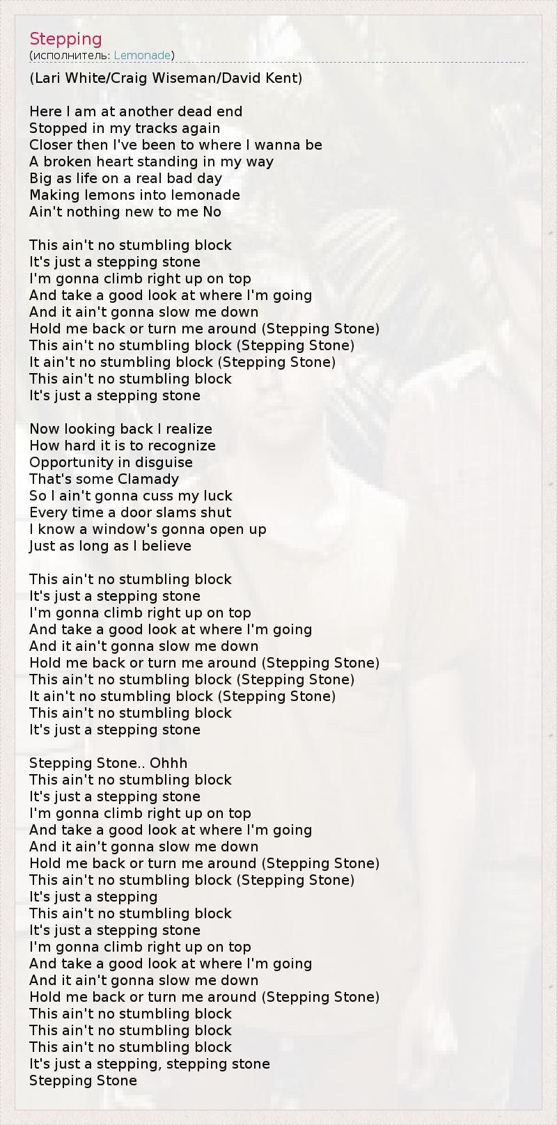 (Lari White/Craig Wiseman/David Kent) Here I am at another dead end Stopped in my tracks again Closer then I've been to where I wanna be A broken heart standing in my way Big as life on a real bad day Making lemons into lemonade Ain't nothing new to me No This ain't no stumbling block It's just a stepping stone I'm gonna climb right up on top And take a good look at where I'm going And it ain't gonna slow me down Hold me back or turn me around (Stepping Stone) This ain't no stumbling block (Stepping Stone) It ain't no stumbling block (Stepping Stone) This ain't no stumbling block It's just a stepping stone Now looking back I realize How hard it is to recognize Opportunity in disguise That's some Clamady So I ain't gonna cuss my luck Every time a door slams shut I know a window's gonna open up Just as long as I believe This ain't no stumbling block It's just a stepping stone I'm gonna climb right up on top And take a good look at where I'm going And it ain't gonna slow me down Hold me back or turn me around (Stepping Stone) This ain't no stumbling block (Stepping Stone) It ain't no stumbling block (Stepping Stone) This ain't no stumbling block It's just a stepping stone Stepping Stone.. Ohhh This ain't no stumbling block It's just a stepping stone I'm gonna climb right up on top And take a good look at where I'm going And it ain't gonna slow me down Hold me back or turn me around (Stepping Stone) This ain't no stumbling block (Stepping Stone) It's just a stepping This ain't no stumbling block It's just a stepping stone I'm gonna climb right up on top And take a good look at where I'm going And it ain't gonna slow me down Hold me back or turn me around (Stepping Stone) This ain't no stumbling block This ain't no stumbling block This ain't no stumbling block It's just a stepping, stepping stone Stepping Stone