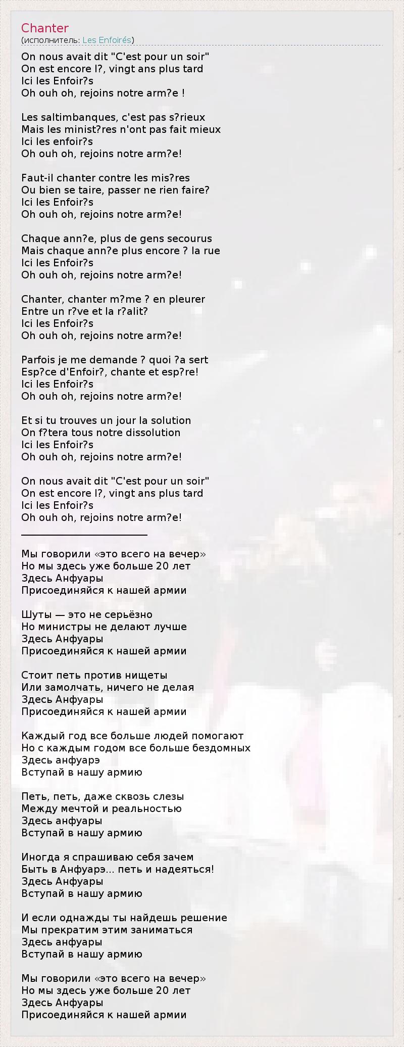 On nous avait dit "C'est pour un soir" On est encore l?, vingt ans plus tard Ici les Enfoir?s Oh ouh oh, rejoins notre arm?e ! Les saltimbanques, c'est pas s?rieux Mais les minist?res n'ont pas fait mieux Ici les enfoir?s Oh ouh oh, rejoins notre arm?e! Faut-il chanter contre les mis?res Ou bien se taire, passer ne rien faire? Ici les Enfoir?s Oh ouh oh, rejoins notre arm?e! Chaque ann?e, plus de gens secourus Mais chaque ann?e plus encore ? la rue Ici les Enfoir?s Oh ouh oh, rejoins notre arm?e! Chanter, chanter m?me ? en pleurer Entre un r?ve et la r?alit? Ici les Enfoir?s Oh ouh oh, rejoins notre arm?e! Parfois je me demande ? quoi ?a sert Esp?ce d'Enfoir?, chante et esp?re! Ici les Enfoir?s Oh ouh oh, rejoins notre arm?e! Et si tu trouves un jour la solution On f?tera tous notre dissolution Ici les Enfoir?s Oh ouh oh, rejoins notre arm?e! On nous avait dit "C'est pour un soir" On est encore l?, vingt ans plus tard Ici les Enfoir?s Oh ouh oh, rejoins notre arm?e! _________________________ Мы говорили «это всего на вечер» Но мы здесь уже больше 20 лет Здесь Анфуары Присоединяйся к нашей армии Шуты — это не серьёзно Но министры не делают лучше Здесь Анфуары Присоединяйся к нашей армии Стоит петь против нищеты Или замолчать, ничего не делая Здесь Анфуары Присоединяйся к нашей армии Каждый год все больше людей помогают Но с каждым годом все больше бездомных Здесь анфуарэ Вступай в нашу армию Петь, петь, даже сквозь слезы Между мечтой и реальностью Здесь анфуары Вступай в нашу армию Иногда я спрашиваю себя зачем Быть в Анфуарэ... петь и надеяться! Здесь Анфуары Вступай в нашу армию И если однажды ты найдешь решение Мы прекратим этим заниматься Здесь анфуары Вступай в нашу армию Мы говорили «это всего на вечер» Но мы здесь уже больше 20 лет Здесь Анфуары Присоединяйся к нашей армии