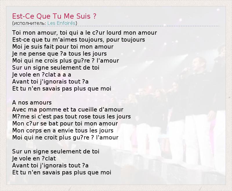 А как ты думаешь, о чем песня "Est-Ce Que Tu Me Suis ?" ?