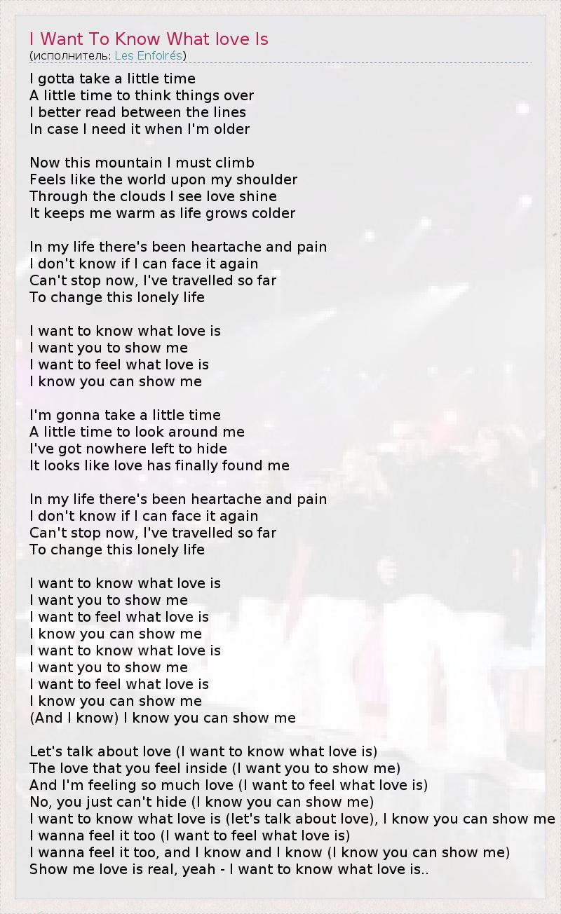 I gotta take a little time A little time to think things over I better read between the lines In case I need it when I'm older Now this mountain I must climb Feels like the world upon my shoulder Through the clouds I see love shine It keeps me warm as life grows colder In my life there's been heartache and pain I don't know if I can face it again Can't stop now, I've travelled so far To change this lonely life I want to know what love is I want you to show me I want to feel what love is I know you can show me I'm gonna take a little time A little time to look around me I've got nowhere left to hide It looks like love has finally found me In my life there's been heartache and pain I don't know if I can face it again Can't stop now, I've travelled so far To change this lonely life I want to know what love is I want you to show me I want to feel what love is I know you can show me I want to know what love is I want you to show me I want to feel what love is I know you can show me (And I know) I know you can show me Let's talk about love (I want to know what love is) The love that you feel inside (I want you to show me) And I'm feeling so much love (I want to feel what love is) No, you just can't hide (I know you can show me) I want to know what love is (let's talk about love), I know you can show me I wanna feel it too (I want to feel what love is) I wanna feel it too, and I know and I know (I know you can show me) Show me love is real, yeah - I want to know what love is..