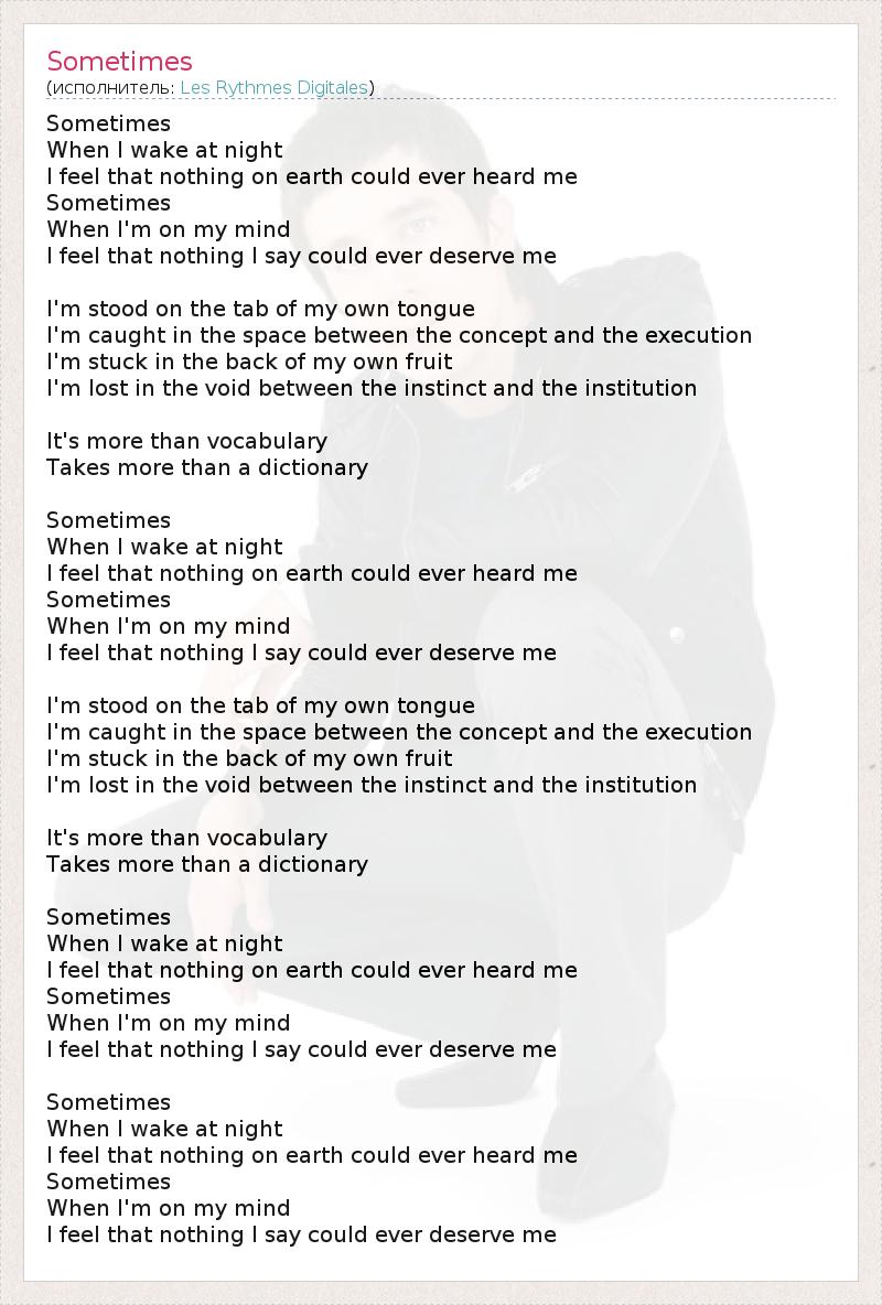 Sometimes When I wake at night I feel that nothing on earth could ever heard me Sometimes When I'm on my mind I feel that nothing I say could ever deserve me I'm stood on the tab of my own tongue I'm caught in the space between the concept and the execution I'm stuck in the back of my own fruit I'm lost in the void between the instinct and the institution It's more than vocabulary Takes more than a dictionary Sometimes When I wake at night I feel that nothing on earth could ever heard me Sometimes When I'm on my mind I feel that nothing I say could ever deserve me I'm stood on the tab of my own tongue I'm caught in the space between the concept and the execution I'm stuck in the back of my own fruit I'm lost in the void between the instinct and the institution It's more than vocabulary Takes more than a dictionary Sometimes When I wake at night I feel that nothing on earth could ever heard me Sometimes When I'm on my mind I feel that nothing I say could ever deserve me Sometimes When I wake at night I feel that nothing on earth could ever heard me Sometimes When I'm on my mind I feel that nothing I say could ever deserve me