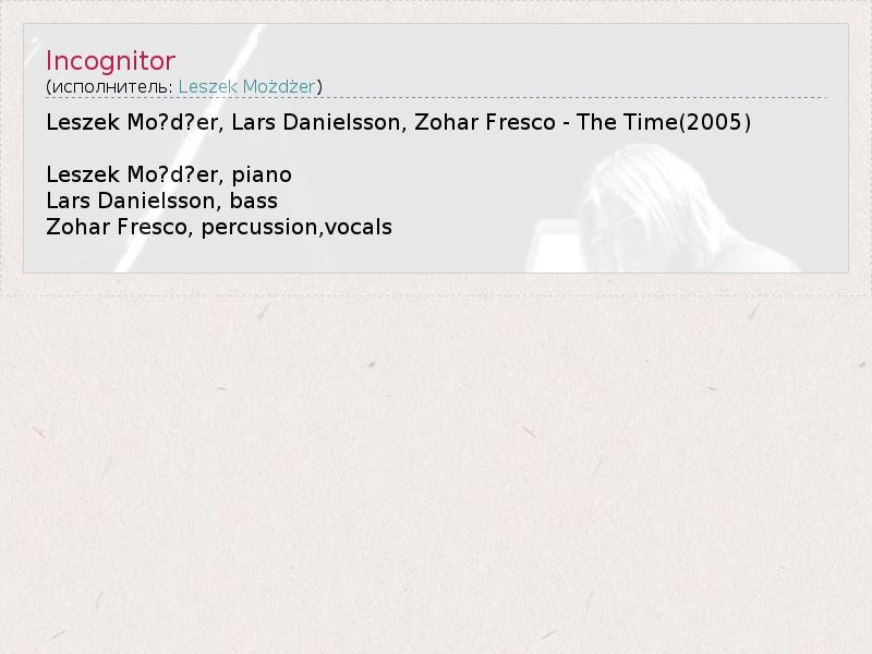 Leszek Mo?d?er, Lars Danielsson, Zohar Fresco - The Time(2005) Leszek Mo?d?er, piano Lars Danielsson, bass Zohar Fresco, percussion,vocals