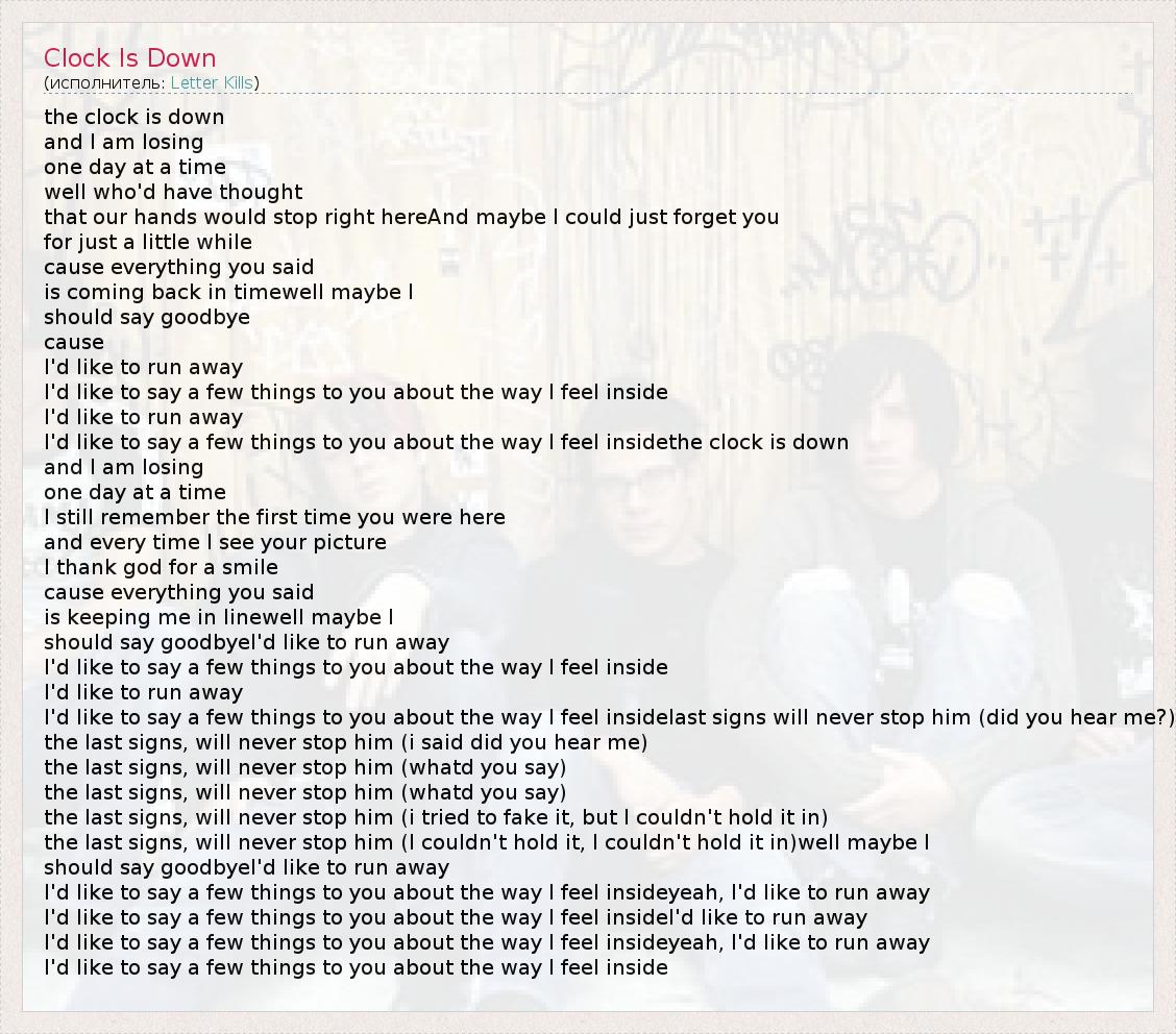 the clock is down and I am losing one day at a time well who'd have thought that our hands would stop right hereAnd maybe I could just forget you for just a little while cause everything you said is coming back in timewell maybe I should say goodbye cause I'd like to run away I'd like to say a few things to you about the way I feel inside I'd like to run away I'd like to say a few things to you about the way I feel insidethe clock is down and I am losing one day at a time I still remember the first time you were here and every time I see your picture I thank god for a smile cause everything you said is keeping me in linewell maybe I should say goodbyeI'd like to run away I'd like to say a few things to you about the way I feel inside I'd like to run away I'd like to say a few things to you about the way I feel insidelast signs will never stop him (did you hear me?) the last signs, will never stop him (i said did you hear me) the last signs, will never stop him (whatd you say) the last signs, will never stop him (whatd you say) the last signs, will never stop him (i tried to fake it, but I couldn't hold it in) the last signs, will never stop him (I couldn't hold it, I couldn't hold it in)well maybe I should say goodbyeI'd like to run away I'd like to say a few things to you about the way I feel insideyeah, I'd like to run away I'd like to say a few things to you about the way I feel insideI'd like to run away I'd like to say a few things to you about the way I feel insideyeah, I'd like to run away I'd like to say a few things to you about the way I feel inside