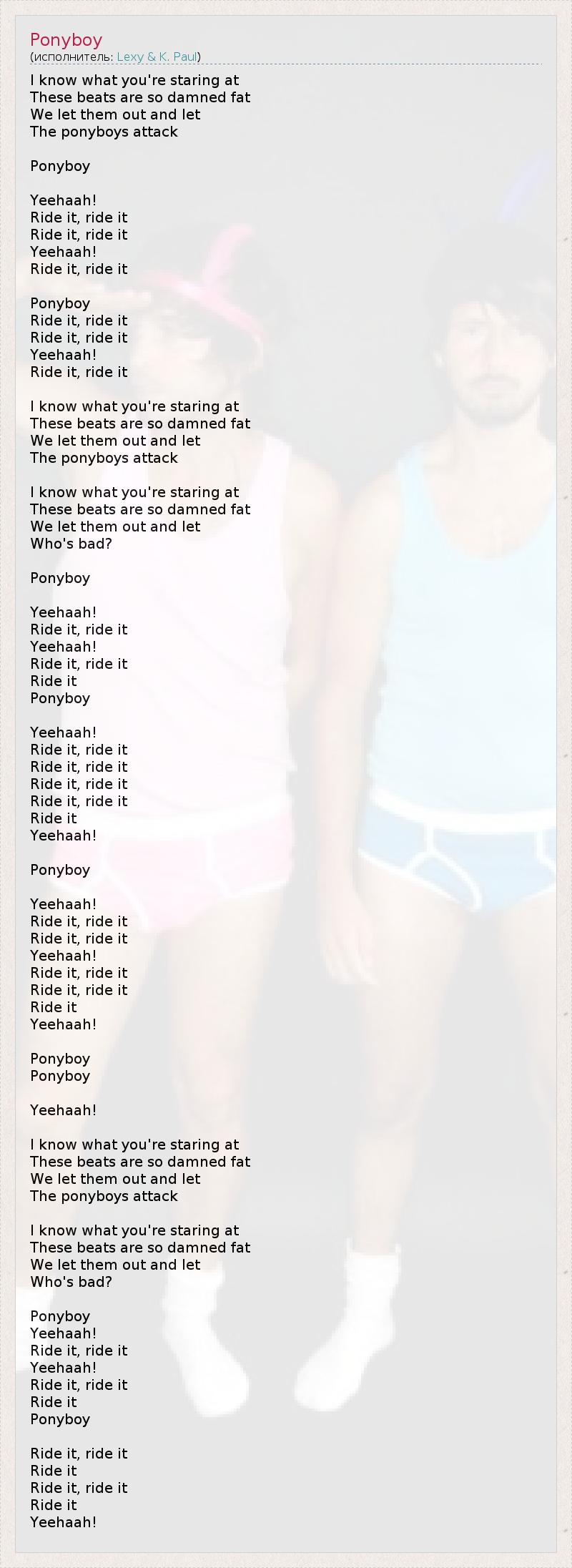 I know what you're staring at These beats are so damned fat We let them out and let The ponyboys attack Ponyboy Yeehaah! Ride it, ride it Ride it, ride it Yeehaah! Ride it, ride it Ponyboy Ride it, ride it Ride it, ride it Yeehaah! Ride it, ride it I know what you're staring at These beats are so damned fat We let them out and let The ponyboys attack I know what you're staring at These beats are so damned fat We let them out and let Who's bad? Ponyboy Yeehaah! Ride it, ride it Yeehaah! Ride it, ride it Ride it Ponyboy Yeehaah! Ride it, ride it Ride it, ride it Ride it, ride it Ride it, ride it Ride it Yeehaah! Ponyboy Yeehaah! Ride it, ride it Ride it, ride it Yeehaah! Ride it, ride it Ride it, ride it Ride it Yeehaah! Ponyboy Ponyboy Yeehaah! I know what you're staring at These beats are so damned fat We let them out and let The ponyboys attack I know what you're staring at These beats are so damned fat We let them out and let Who's bad? Ponyboy Yeehaah! Ride it, ride it Yeehaah! Ride it, ride it Ride it Ponyboy Ride it, ride it Ride it Ride it, ride it Ride it Yeehaah!