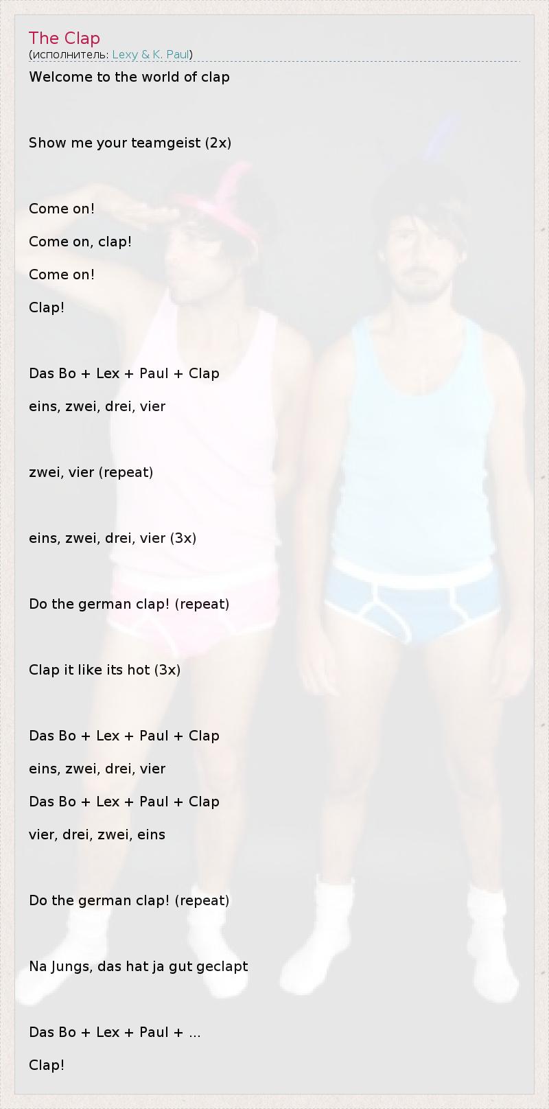 Welcome to the world of clap Show me your teamgeist (2x) Come on! Come on, clap! Come on! Clap! Das Bo + Lex + Paul + Clap eins, zwei, drei, vier zwei, vier (repeat) eins, zwei, drei, vier (3x) Do the german clap! (repeat) Clap it like its hot (3x) Das Bo + Lex + Paul + Clap eins, zwei, drei, vier Das Bo + Lex + Paul + Clap vier, drei, zwei, eins Do the german clap! (repeat) Na Jungs, das hat ja gut geclapt Das Bo + Lex + Paul + ... Clap!