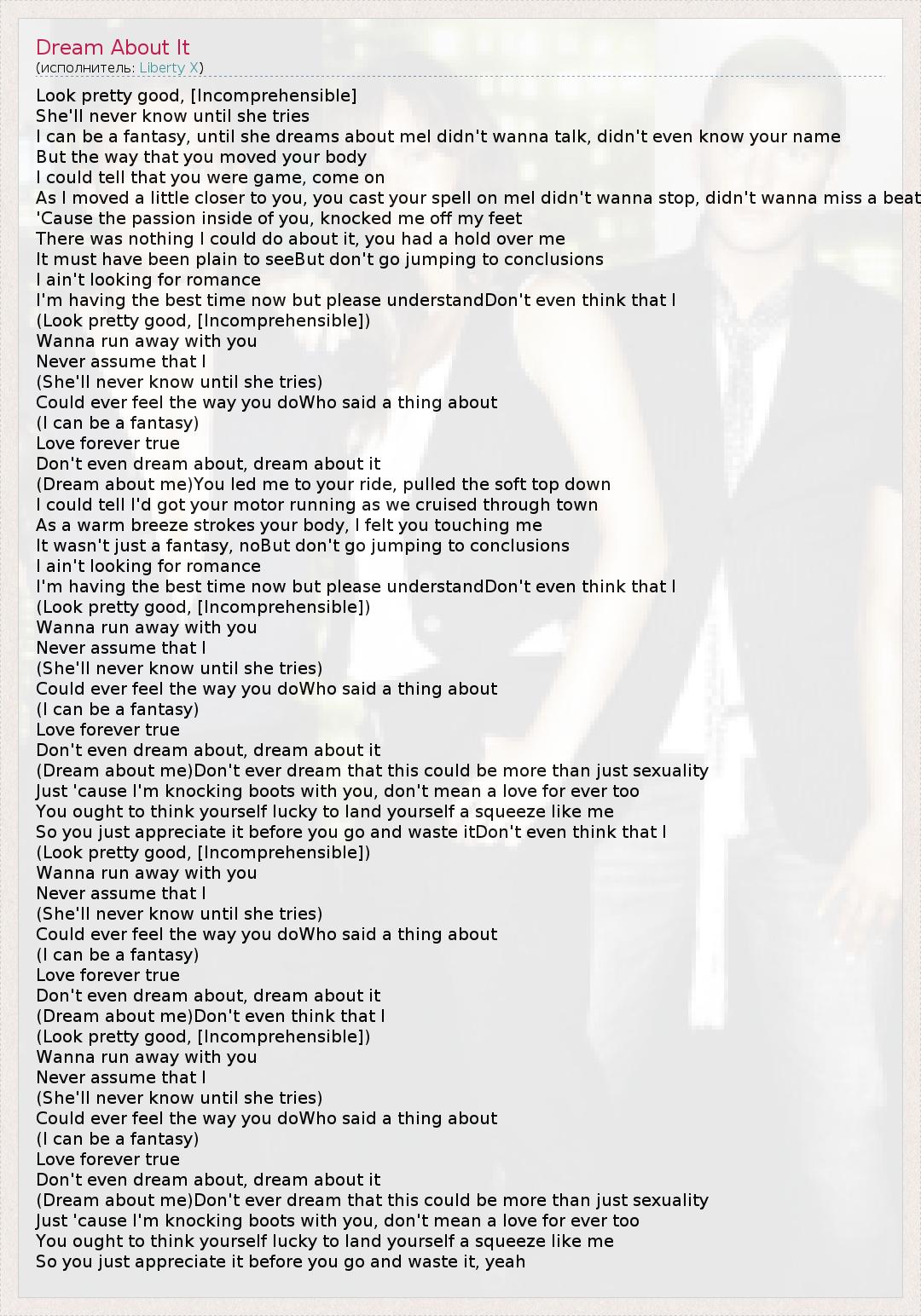 Look pretty good, [Incomprehensible] She'll never know until she tries I can be a fantasy, until she dreams about meI didn't wanna talk, didn't even know your name But the way that you moved your body I could tell that you were game, come on As I moved a little closer to you, you cast your spell on meI didn't wanna stop, didn't wanna miss a beat 'Cause the passion inside of you, knocked me off my feet There was nothing I could do about it, you had a hold over me It must have been plain to seeBut don't go jumping to conclusions I ain't looking for romance I'm having the best time now but please understandDon't even think that I (Look pretty good, [Incomprehensible]) Wanna run away with you Never assume that I (She'll never know until she tries) Could ever feel the way you doWho said a thing about (I can be a fantasy) Love forever true Don't even dream about, dream about it (Dream about me)You led me to your ride, pulled the soft top down I could tell I'd got your motor running as we cruised through town As a warm breeze strokes your body, I felt you touching me It wasn't just a fantasy, noBut don't go jumping to conclusions I ain't looking for romance I'm having the best time now but please understandDon't even think that I (Look pretty good, [Incomprehensible]) Wanna run away with you Never assume that I (She'll never know until she tries) Could ever feel the way you doWho said a thing about (I can be a fantasy) Love forever true Don't even dream about, dream about it (Dream about me)Don't ever dream that this could be more than just sexuality Just 'cause I'm knocking boots with you, don't mean a love for ever too You ought to think yourself lucky to land yourself a squeeze like me So you just appreciate it before you go and waste itDon't even think that I (Look pretty good, [Incomprehensible]) Wanna run away with you Never assume that I (She'll never know until she tries) Could ever feel the way you doWho said a thing about (I can be a fantasy) Love forever true Don't even dream about, dream about it (Dream about me)Don't even think that I (Look pretty good, [Incomprehensible]) Wanna run away with you Never assume that I (She'll never know until she tries) Could ever feel the way you doWho said a thing about (I can be a fantasy) Love forever true Don't even dream about, dream about it (Dream about me)Don't ever dream that this could be more than just sexuality Just 'cause I'm knocking boots with you, don't mean a love for ever too You ought to think yourself lucky to land yourself a squeeze like me So you just appreciate it before you go and waste it, yeah