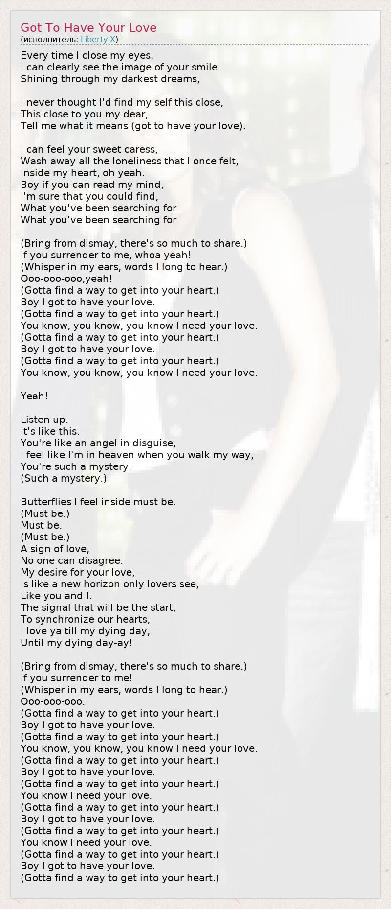 Every time I close my eyes, I can clearly see the image of your smile Shining through my darkest dreams, I never thought I'd find my self this close, This close to you my dear, Tell me what it means (got to have your love). I can feel your sweet caress, Wash away all the loneliness that I once felt, Inside my heart, oh yeah. Boy if you can read my mind, I'm sure that you could find, What you've been searching for What you've been searching for (Bring from dismay, there's so much to share.) If you surrender to me, whoa yeah! (Whisper in my ears, words I long to hear.) Ooo-ooo-ooo,yeah! (Gotta find a way to get into your heart.) Boy I got to have your love. (Gotta find a way to get into your heart.) You know, you know, you know I need your love. (Gotta find a way to get into your heart.) Boy I got to have your love. (Gotta find a way to get into your heart.) You know, you know, you know I need your love. Yeah! Listen up. It's like this. You're like an angel in disguise, I feel like I'm in heaven when you walk my way, You're such a mystery. (Such a mystery.) Butterflies I feel inside must be. (Must be.) Must be. (Must be.) A sign of love, No one can disagree. My desire for your love, Is like a new horizon only lovers see, Like you and I. The signal that will be the start, To synchronize our hearts, I love ya till my dying day, Until my dying day-ay! (Bring from dismay, there's so much to share.) If you surrender to me! (Whisper in my ears, words I long to hear.) Ooo-ooo-ooo. (Gotta find a way to get into your heart.) Boy I got to have your love. (Gotta find a way to get into your heart.) You know, you know, you know I need your love. (Gotta find a way to get into your heart.) Boy I got to have your love. (Gotta find a way to get into your heart.) You know I need your love. (Gotta find a way to get into your heart.) Boy I got to have your love. (Gotta find a way to get into your heart.) You know I need your love. (Gotta find a way to get into your heart.) Boy I got to have your love. (Gotta find a way to get into your heart.)