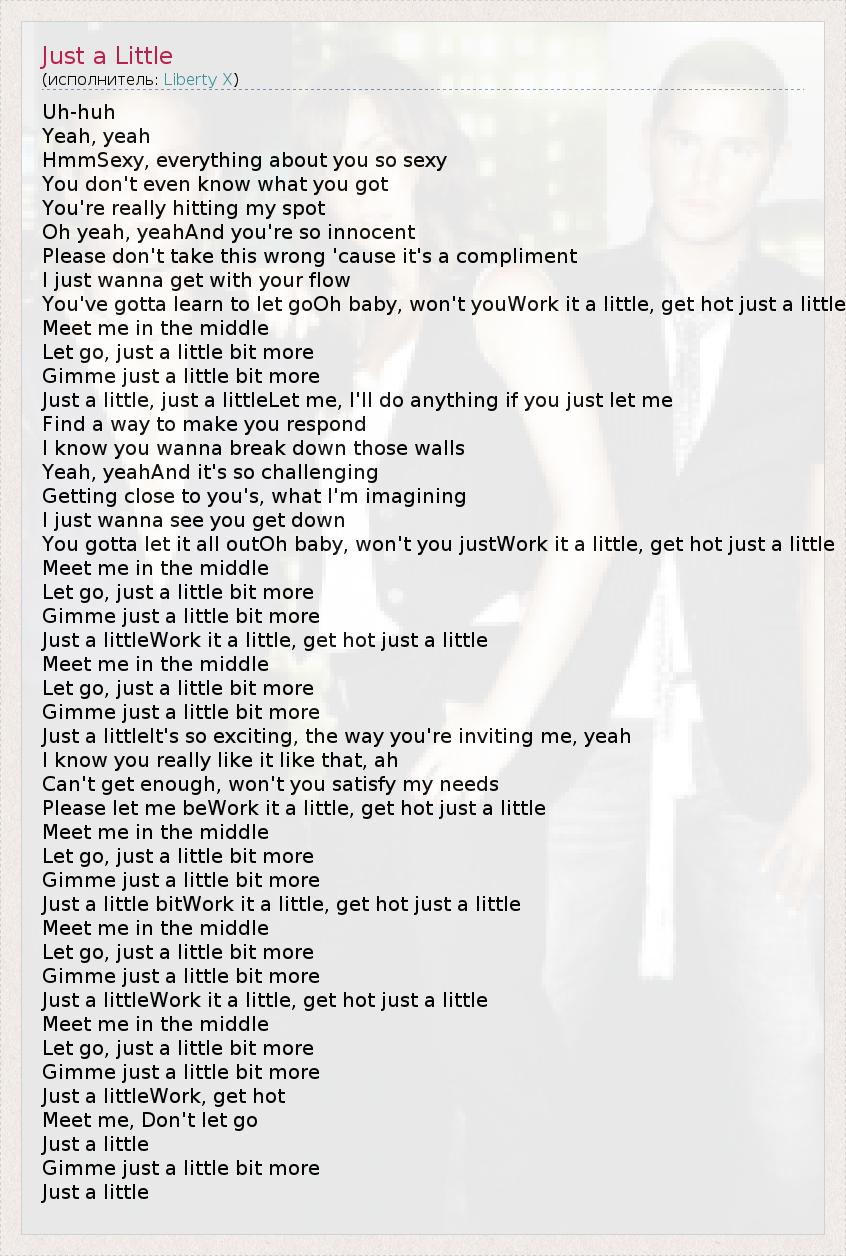 Uh-huh Yeah, yeah HmmSexy, everything about you so sexy You don't even know what you got You're really hitting my spot Oh yeah, yeahAnd you're so innocent Please don't take this wrong 'cause it's a compliment I just wanna get with your flow You've gotta learn to let goOh baby, won't youWork it a little, get hot just a little Meet me in the middle Let go, just a little bit more Gimme just a little bit more Just a little, just a littleLet me, I'll do anything if you just let me Find a way to make you respond I know you wanna break down those walls Yeah, yeahAnd it's so challenging Getting close to you's, what I'm imagining I just wanna see you get down You gotta let it all outOh baby, won't you justWork it a little, get hot just a little Meet me in the middle Let go, just a little bit more Gimme just a little bit more Just a littleWork it a little, get hot just a little Meet me in the middle Let go, just a little bit more Gimme just a little bit more Just a littleIt's so exciting, the way you're inviting me, yeah I know you really like it like that, ah Can't get enough, won't you satisfy my needs Please let me beWork it a little, get hot just a little Meet me in the middle Let go, just a little bit more Gimme just a little bit more Just a little bitWork it a little, get hot just a little Meet me in the middle Let go, just a little bit more Gimme just a little bit more Just a littleWork it a little, get hot just a little Meet me in the middle Let go, just a little bit more Gimme just a little bit more Just a littleWork, get hot Meet me, Don't let go Just a little Gimme just a little bit more Just a little