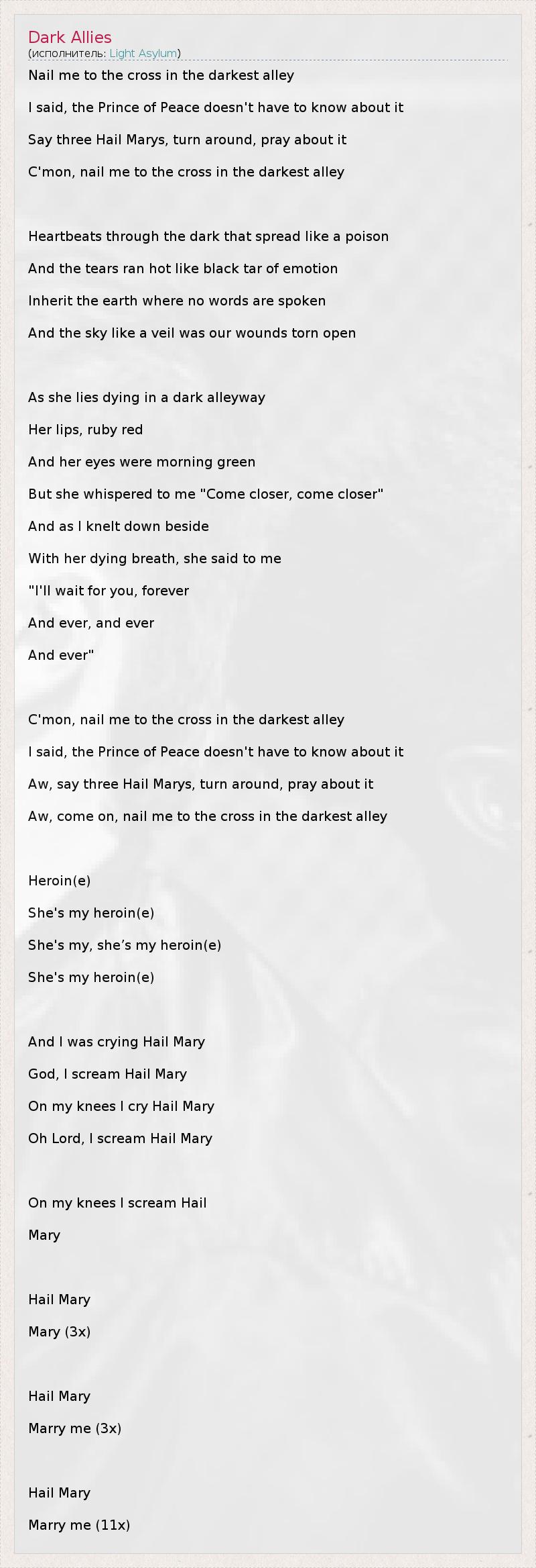 Nail me to the cross in the darkest alley I said, the Prince of Peace doesn't have to know about it Say three Hail Marys, turn around, pray about it C'mon, nail me to the cross in the darkest alley Heartbeats through the dark that spread like a poison And the tears ran hot like black tar of emotion Inherit the earth where no words are spoken And the sky like a veil was our wounds torn open As she lies dying in a dark alleyway Her lips, ruby red And her eyes were morning green But she whispered to me "Come closer, come closer" And as I knelt down beside With her dying breath, she said to me "I'll wait for you, forever And ever, and ever And ever" C'mon, nail me to the cross in the darkest alley I said, the Prince of Peace doesn't have to know about it Aw, say three Hail Marys, turn around, pray about it Aw, come on, nail me to the cross in the darkest alley Heroin(e) She's my heroin(e) She's my, she’s my heroin(e) She's my heroin(e) And I was crying Hail Mary God, I scream Hail Mary On my knees I cry Hail Mary Oh Lord, I scream Hail Mary On my knees I scream Hail Mary Hail Mary Mary (3x) Hail Mary Marry me (3x) Hail Mary Marry me (11x)
