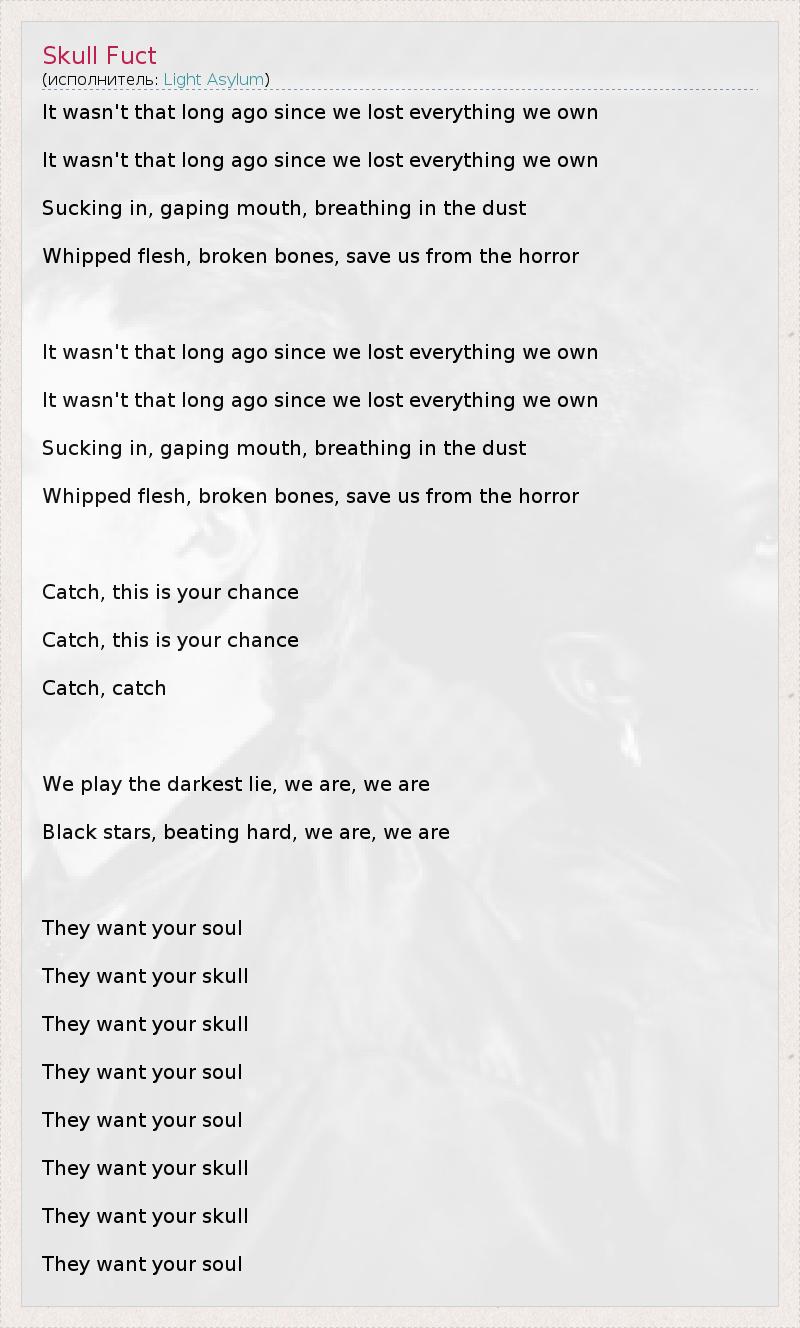 It wasn't that long ago since we lost everything we own It wasn't that long ago since we lost everything we own Sucking in, gaping mouth, breathing in the dust Whipped flesh, broken bones, save us from the horror It wasn't that long ago since we lost everything we own It wasn't that long ago since we lost everything we own Sucking in, gaping mouth, breathing in the dust Whipped flesh, broken bones, save us from the horror Catch, this is your chance Catch, this is your chance Catch, catch We play the darkest lie, we are, we are Black stars, beating hard, we are, we are They want your soul They want your skull They want your skull They want your soul They want your soul They want your skull They want your skull They want your soul