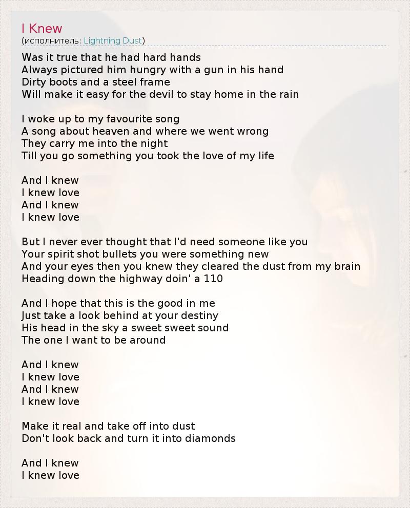 Was it true that he had hard hands Always pictured him hungry with a gun in his hand Dirty boots and a steel frame Will make it easy for the devil to stay home in the rain I woke up to my favourite song A song about heaven and where we went wrong They carry me into the night Till you go something you took the love of my life And I knew I knew love And I knew I knew love But I never ever thought that I'd need someone like you Your spirit shot bullets you were something new And your eyes then you knew they cleared the dust from my brain Heading down the highway doin' a 110 And I hope that this is the good in me Just take a look behind at your destiny His head in the sky a sweet sweet sound The one I want to be around And I knew I knew love And I knew I knew love Make it real and take off into dust Don't look back and turn it into diamonds And I knew I knew love
