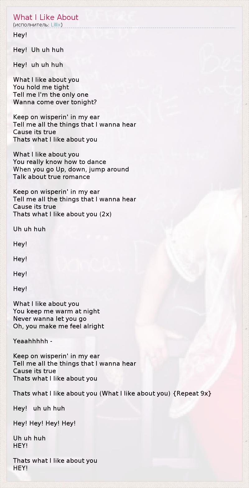 Эй! Эй! А-ага! Эй! А-ага! Что мне нравится в тебе? То, как крепко ты меня обнимаешь, Говоришь, что я - единственная и неповторимая, Придёшь ко мне сегодня? Продолжаешь шептать мне на ушко, Говоришь мне то, что я хотела бы услышать, И это - правда, Вот, что мне нравится в тебе! Что мне нравится в тебе, Это то, как ты танцуешь: Двигаешься вверх-вниз, крутишься по сторонам, Похоже, я влюбилась... Продолжаешь шептать мне на ушко, Говоришь мне то, что я хотела бы услышать, И это - правда, Вот, что мне нравится в тебе! (2 раза) А-ага! Эй! Эй! Эй! Эй! Что мне нравится в тебе? Ты не даёшь мне остыть ночью, Никогда не отпущу тебя, Ох, мне с тобой так повезло! Да-а-а-а! Продолжаешь шептать мне на ушко, Говоришь мне то, что я хотела бы услышать, И это - правда, Вот, что мне нравится в тебе! Вот, что мне нравится в тебе (Что мне нравится в тебе) 9x Эй! А-ага! Эй! Эй! Эй! Эй! А-ага! ЭЙ! Вот, что мне нравится в тебе! ЭЙ!