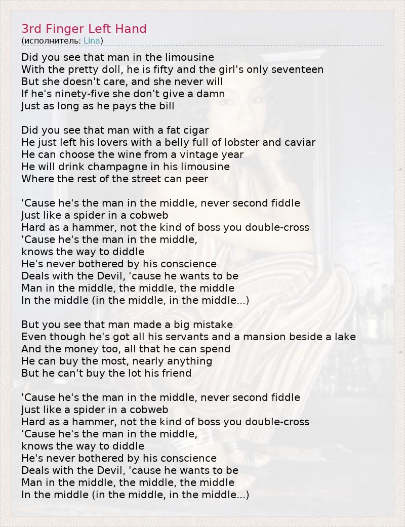 А как ты думаешь, о чем песня "3rd Finger Left Hand" ?