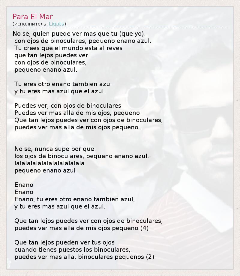 No se, quien puede ver mas que tu (que yo). con ojos de binoculares, pequeno enano azul. Tu crees que el mundo esta al reves que tan lejos puedes ver con ojos de binoculares, pequeno enano azul. Tu eres otro enano tambien azul y tu eres mas azul que el azul. Puedes ver, con ojos de binoculares Puedes ver mas alla de mis ojos, pequeno Que tan lejos puedes ver con ojos de binoculares, puedes ver mas alla de mis ojos pequeno. No se, nunca supe por que los ojos de binoculares, pequeno enano azul.. lalalalalalalalalalalalala pequeno enano azul Enano Enano Enano, tu eres otro enano tambien azul, y tu eres mas azul que el azul. Que tan lejos puedes ver con ojos de binoculares, puedes ver mas alla de mis ojos pequeno (4) Que tan lejos pueden ver tus ojos cuando tienes puestos los binoculares, puedes ver mas alla, binoculares pequenos (2)