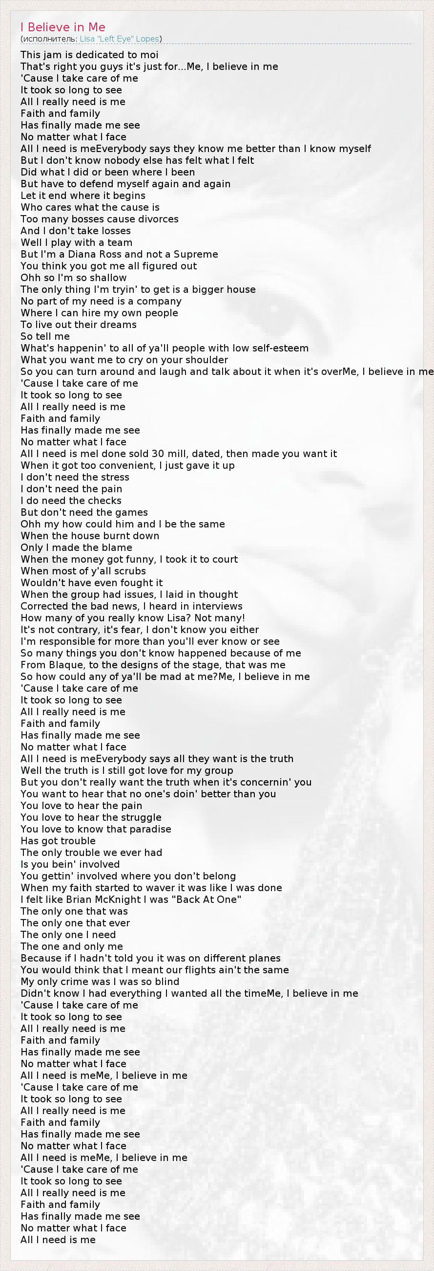 This jam is dedicated to moi That's right you guys it's just for...Me, I believe in me 'Cause I take care of me It took so long to see All I really need is me Faith and family Has finally made me see No matter what I face All I need is meEverybody says they know me better than I know myself But I don't know nobody else has felt what I felt Did what I did or been where I been But have to defend myself again and again Let it end where it begins Who cares what the cause is Too many bosses cause divorces And I don't take losses Well I play with a team But I'm a Diana Ross and not a Supreme You think you got me all figured out Ohh so I'm so shallow The only thing I'm tryin' to get is a bigger house No part of my need is a company Where I can hire my own people To live out their dreams So tell me What's happenin' to all of ya'll people with low self-esteem What you want me to cry on your shoulder So you can turn around and laugh and talk about it when it's overMe, I believe in me 'Cause I take care of me It took so long to see All I really need is me Faith and family Has finally made me see No matter what I face All I need is meI done sold 30 mill, dated, then made you want it When it got too convenient, I just gave it up I don't need the stress I don't need the pain I do need the checks But don't need the games Ohh my how could him and I be the same When the house burnt down Only I made the blame When the money got funny, I took it to court When most of y'all scrubs Wouldn't have even fought it When the group had issues, I laid in thought Corrected the bad news, I heard in interviews How many of you really know Lisa? Not many! It's not contrary, it's fear, I don't know you either I'm responsible for more than you'll ever know or see So many things you don't know happened because of me From Blaque, to the designs of the stage, that was me So how could any of ya'll be mad at me?Me, I believe in me 'Cause I take care of me It took so long to see All I really need is me Faith and family Has finally made me see No matter what I face All I need is meEverybody says all they want is the truth Well the truth is I still got love for my group But you don't really want the truth when it's concernin' you You want to hear that no one's doin' better than you You love to hear the pain You love to hear the struggle You love to know that paradise Has got trouble The only trouble we ever had Is you bein' involved You gettin' involved where you don't belong When my faith started to waver it was like I was done I felt like Brian McKnight I was "Back At One" The only one that was The only one that ever The only one I need The one and only me Because if I hadn't told you it was on different planes You would think that I meant our flights ain't the same My only crime was I was so blind Didn't know I had everything I wanted all the timeMe, I believe in me 'Cause I take care of me It took so long to see All I really need is me Faith and family Has finally made me see No matter what I face All I need is meMe, I believe in me 'Cause I take care of me It took so long to see All I really need is me Faith and family Has finally made me see No matter what I face All I need is meMe, I believe in me 'Cause I take care of me It took so long to see All I really need is me Faith and family Has finally made me see No matter what I face All I need is me