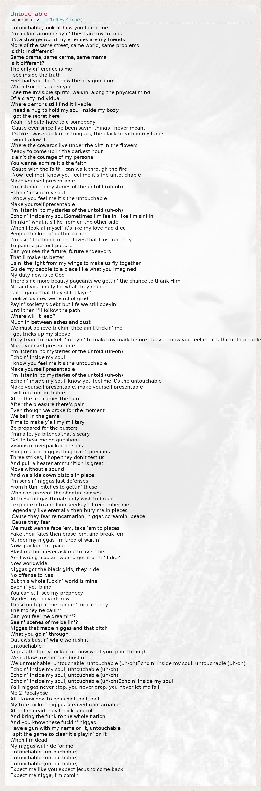 Это интересно:Спустя 8 лет после релиза дебютного сольника ныне покойной Lisa «Left Eye» Lopes «Supernova» выходит ее второй альбом под названием «Eye Legacy». Изначально запланированный на этот месяц релиз теперь ожидается в январе. В «Eye Legacy» войдут неизданные записи участницы легендарного трио TLC, сделанные до трагической автокатастрофы 2002 года. Альбом будет состоять из 12 треков. Среди гостей: Lil Mama, Chamillionaire, Missy... продолжение