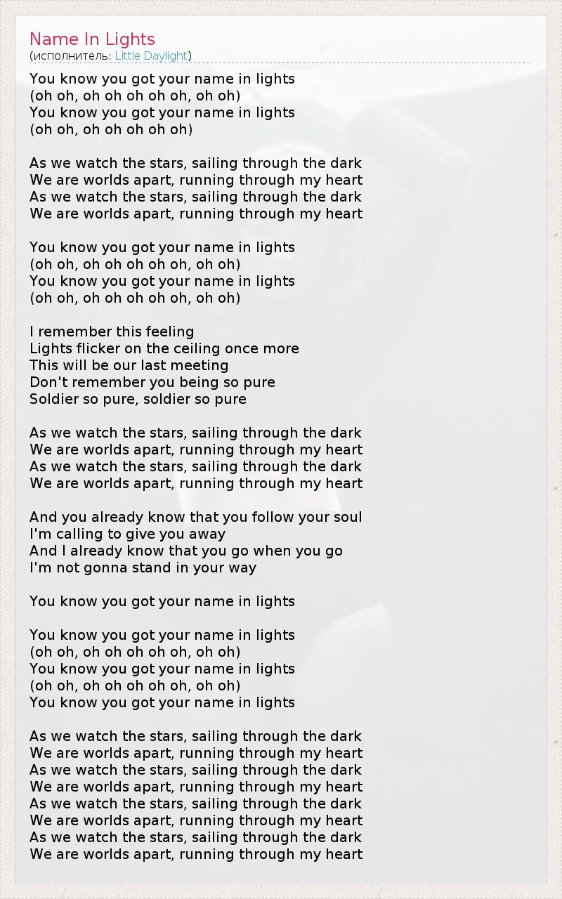 You know you got your name in lights (oh oh, oh oh oh oh oh, oh oh) You know you got your name in lights (oh oh, oh oh oh oh oh) As we watch the stars, sailing through the dark We are worlds apart, running through my heart As we watch the stars, sailing through the dark We are worlds apart, running through my heart You know you got your name in lights (oh oh, oh oh oh oh oh, oh oh) You know you got your name in lights (oh oh, oh oh oh oh oh, oh oh) I remember this feeling Lights flicker on the ceiling once more This will be our last meeting Don't remember you being so pure Soldier so pure, soldier so pure As we watch the stars, sailing through the dark We are worlds apart, running through my heart As we watch the stars, sailing through the dark We are worlds apart, running through my heart And you already know that you follow your soul I'm calling to give you away And I already know that you go when you go I'm not gonna stand in your way You know you got your name in lights You know you got your name in lights (oh oh, oh oh oh oh oh, oh oh) You know you got your name in lights (oh oh, oh oh oh oh oh, oh oh) You know you got your name in lights As we watch the stars, sailing through the dark We are worlds apart, running through my heart As we watch the stars, sailing through the dark We are worlds apart, running through my heart As we watch the stars, sailing through the dark We are worlds apart, running through my heart As we watch the stars, sailing through the dark We are worlds apart, running through my heart