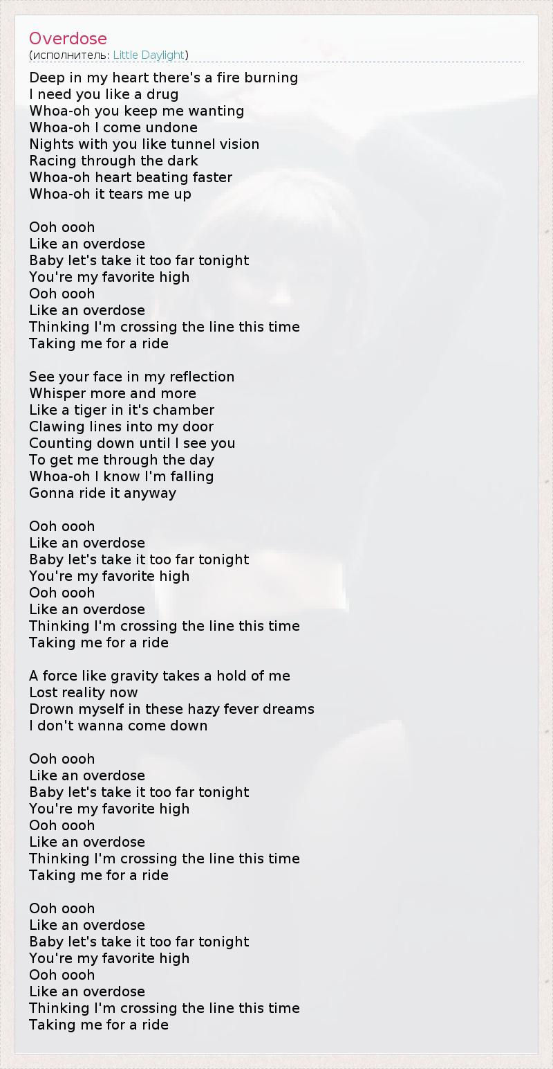 Глубоко в моей душе пылает пламя, Ты нужна мне, как наркотик, Эй-эй, ты всё искушаешь меня, Эй-эй, я схожу с ума! Ночи с тобой – словно опьянённый взгляд, Гонка во тьме, Эй-эй, пульс ускоряется, Эй-эй, у меня взрывается мозг! Ооо, ооо, Как передоз, Детка, давай сегодня перейдём грань, От тебя у меня лучший приход, Ооо, ооо, Как передоз, По-моему, на этот раз я зашёл слишком далеко, Меня уносит... Я вижу твоё лицо в зеркале, Шёпот всё настойчивей, Я, будто тигр в клетке, Царапаю свою дверь, Считаю время до нашей встречи, Чтобы пережить день. О, я знаю, что подсел, Но всё равно приму дозу... Ооо, ооо, Как передоз, Детка, давай сегодня перейдём грань, От тебя у меня лучший приход, Ооо, ооо, Как передоз, По-моему, на этот раз я зашёл слишком далеко, Меня уносит... Мной управляет сила, не уступающая гравитации, Я утратил чувство реальности, Утопил себя в смутных бредовых мечтах И не хочу возвращаться... Ооо, ооо, Как передоз, Детка, давай сегодня перейдём грань, От тебя у меня лучший приход, Ооо, ооо, Как передоз, По-моему, на этот раз я зашёл слишком далеко, Меня уносит... Ооо, ооо, Как передоз, Детка, давай сегодня перейдём грань, От тебя у меня лучший приход, Ооо, ооо, Как передоз, По-моему, на этот раз я зашёл слишком далеко, Меня уносит...