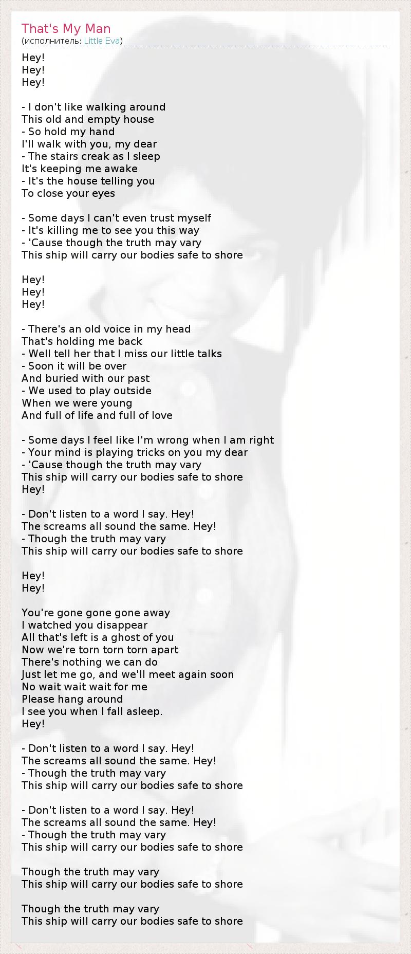 Хэй! Хэй! Хэй! - Я не люблю бродить вокруг Этого старого пустого дома. - Так возьми меня за руку, Пройдёмся вместе, дорогая. - Скрип ступенек Не даёт мне уснуть. - Это дом подсказывает тебе Закрыть глаза. - Порой я даже себе не доверяю. - Меня убивает видеть тебя такой. - И хотя правда переменчива, Корабль этот доставит нас к берегу невредимыми. Хэй! Хэй! Хэй! - В голове знакомый голос, Который не отпускает меня. - Что ж, скажи ей, что мне не хватает небольших бесед. - Скоро всё будет кончено, Похоронено вместе с нашим прошлым. - Будучи юнцами, Мы играли во дворе И были полны жизни и любви. - Порой я чувствую, будто неправа, хотя это не так. - Твой разум играет с тобой, дорогая. - И хотя правда переменчива, Корабль этот доставит нас к берегу невредимыми. Хэй! - Не обращай внимания на мои слова. Хэй! Все вопли похожи. Хэй! - И хотя правда переменчива, Корабль этот доставит нас к берегу невредимыми. Хэй! Хэй! Ты ушёл, покинул меня, И я видела, как ты исчезаешь - Кроме твоего призрака ничего не осталось. Теперь мы не вместе, расстались, И ничего с этим не поделать - Просто отпусти меня, и вскоре мы вновь встретимся. Нет, подожди меня, постой, Прошу, будь рядом - Я вижу тебя в своих снах. Хэй! - Не обращай внимания на мои слова. Хэй! Все вопли похожи. Хэй! - И хотя правда переменчива, Корабль этот доставит нас к берегу невредимыми. - Не обращай внимания на мои слова. Хэй! Все вопли похожи. Хэй! - И хотя правда переменчива, Корабль этот доставит нас к берегу невредимыми. И хотя правда переменчива, Корабль этот доставит нас к берегу невредимыми. И хотя правда переменчива, Корабль этот доставит нас к берегу невредимыми.