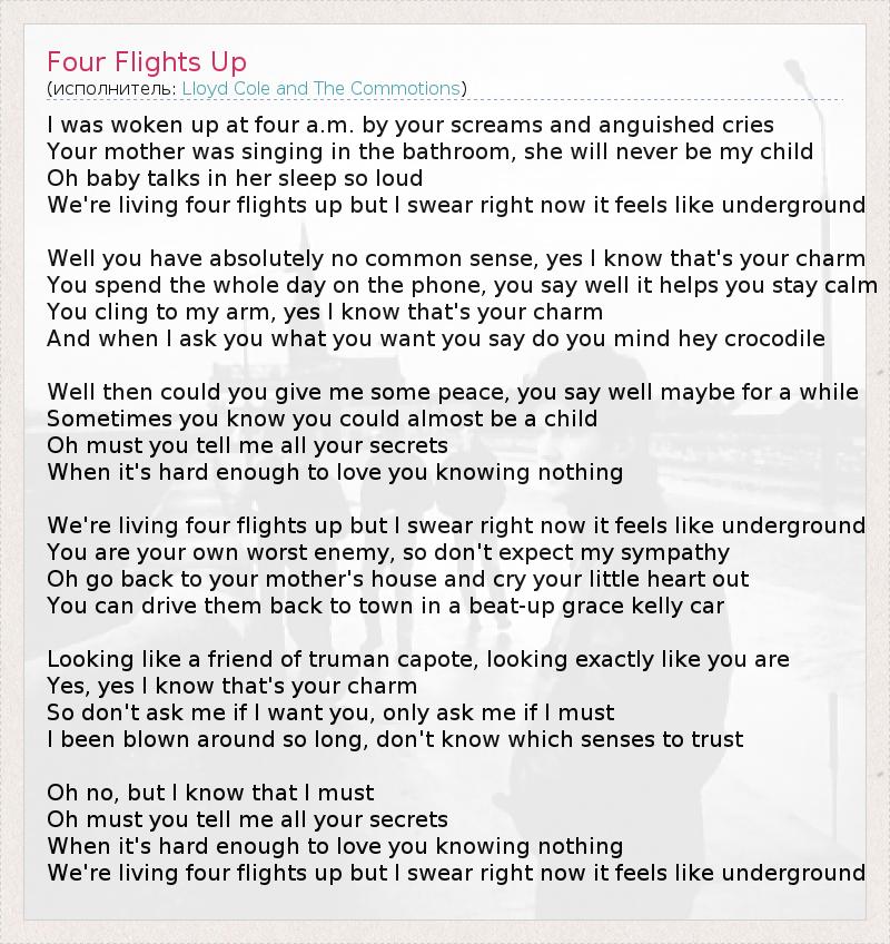 I was woken up at four a.m. by your screams and anguished cries Your mother was singing in the bathroom, she will never be my child Oh baby talks in her sleep so loud We're living four flights up but I swear right now it feels like underground Well you have absolutely no common sense, yes I know that's your charm You spend the whole day on the phone, you say well it helps you stay calm You cling to my arm, yes I know that's your charm And when I ask you what you want you say do you mind hey crocodile Well then could you give me some peace, you say well maybe for a while Sometimes you know you could almost be a child Oh must you tell me all your secrets When it's hard enough to love you knowing nothing We're living four flights up but I swear right now it feels like underground You are your own worst enemy, so don't expect my sympathy Oh go back to your mother's house and cry your little heart out You can drive them back to town in a beat-up grace kelly car Looking like a friend of truman capote, looking exactly like you are Yes, yes I know that's your charm So don't ask me if I want you, only ask me if I must I been blown around so long, don't know which senses to trust Oh no, but I know that I must Oh must you tell me all your secrets When it's hard enough to love you knowing nothing We're living four flights up but I swear right now it feels like underground