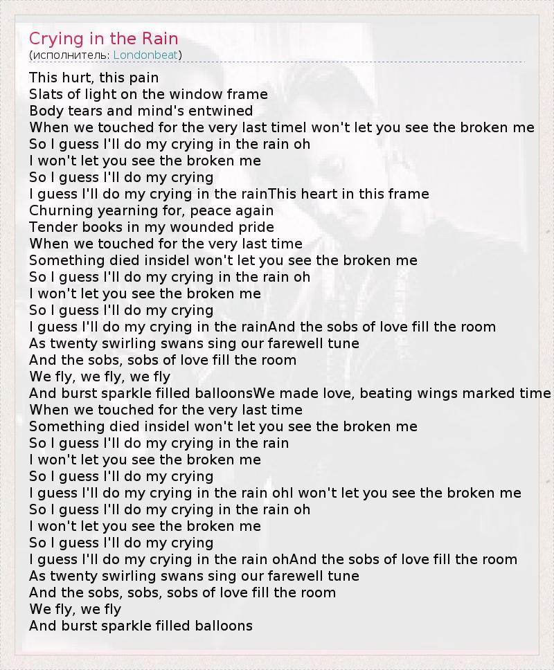I guess I'll do my crying in the rain ohI won't let you see the broken me