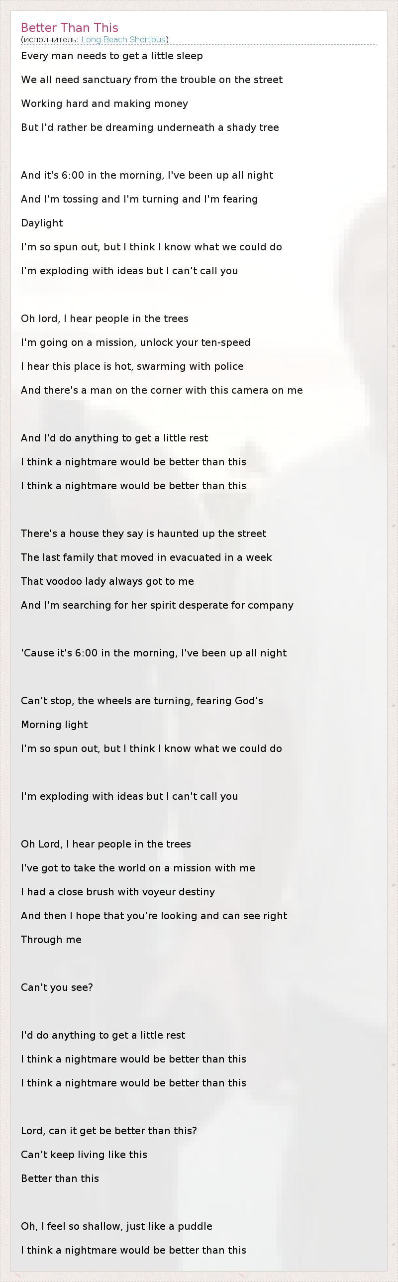 Every man needs to get a little sleep We all need sanctuary from the trouble on the street Working hard and making money But I'd rather be dreaming underneath a shady tree And it's 6:00 in the morning, I've been up all night And I'm tossing and I'm turning and I'm fearing Daylight I'm so spun out, but I think I know what we could do I'm exploding with ideas but I can't call you Oh lord, I hear people in the trees I'm going on a mission, unlock your ten-speed I hear this place is hot, swarming with police And there's a man on the corner with this camera on me And I'd do anything to get a little rest I think a nightmare would be better than this I think a nightmare would be better than this There's a house they say is haunted up the street The last family that moved in evacuated in a week That voodoo lady always got to me And I'm searching for her spirit desperate for company 'Cause it's 6:00 in the morning, I've been up all night Can't stop, the wheels are turning, fearing God's Morning light I'm so spun out, but I think I know what we could do I'm exploding with ideas but I can't call you Oh Lord, I hear people in the trees I've got to take the world on a mission with me I had a close brush with voyeur destiny And then I hope that you're looking and can see right Through me Can't you see? I'd do anything to get a little rest I think a nightmare would be better than this I think a nightmare would be better than this Lord, can it get be better than this? Can't keep living like this Better than this Oh, I feel so shallow, just like a puddle I think a nightmare would be better than this