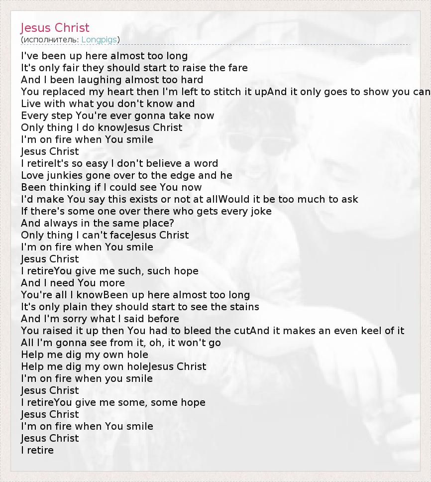 I've been up here almost too long It's only fair they should start to raise the fare And I been laughing almost too hard You replaced my heart then I'm left to stitch it upAnd it only goes to show you can Live with what you don't know and Every step You're ever gonna take now Only thing I do knowJesus Christ I'm on fire when You smile Jesus Christ I retireIt's so easy I don't believe a word Love junkies gone over to the edge and he Been thinking if I could see You now I'd make You say this exists or not at allWould it be too much to ask If there's some one over there who gets every joke And always in the same place? Only thing I can't faceJesus Christ I'm on fire when You smile Jesus Christ I retireYou give me such, such hope And I need You more You're all I knowBeen up here almost too long It's only plain they should start to see the stains And I'm sorry what I said before You raised it up then You had to bleed the cutAnd it makes an even keel of it All I'm gonna see from it, oh, it won't go Help me dig my own hole Help me dig my own holeJesus Christ I'm on fire when you smile Jesus Christ I retireYou give me some, some hope Jesus Christ I'm on fire when You smile Jesus Christ I retire