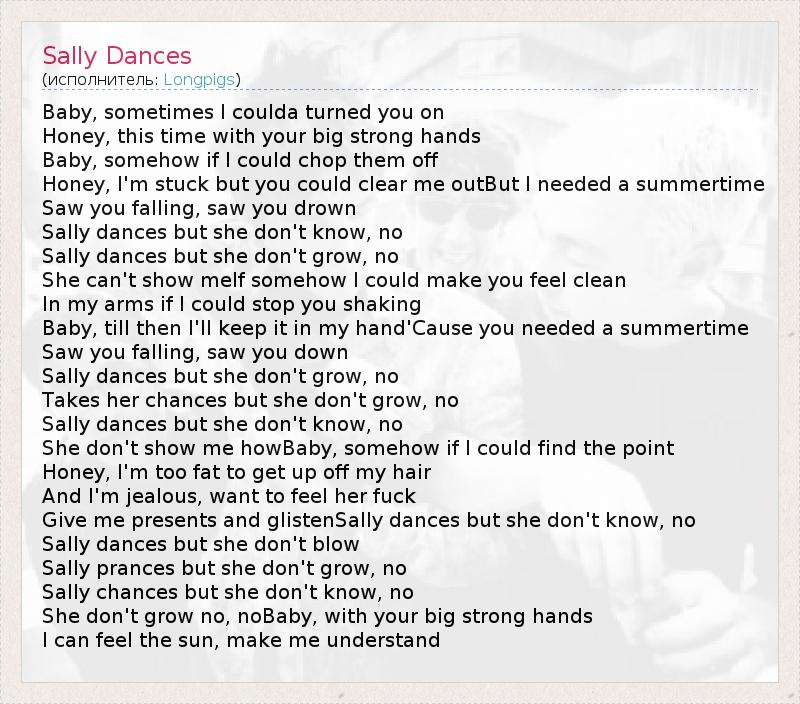 Baby, sometimes I coulda turned you on Honey, this time with your big strong hands Baby, somehow if I could chop them off Honey, I'm stuck but you could clear me outBut I needed a summertime Saw you falling, saw you drown Sally dances but she don't know, no Sally dances but she don't grow, no She can't show meIf somehow I could make you feel clean In my arms if I could stop you shaking Baby, till then I'll keep it in my hand'Cause you needed a summertime Saw you falling, saw you down Sally dances but she don't grow, no Takes her chances but she don't grow, no Sally dances but she don't know, no She don't show me howBaby, somehow if I could find the point Honey, I'm too fat to get up off my hair And I'm jealous, want to feel her fuck Give me presents and glistenSally dances but she don't know, no Sally dances but she don't blow Sally prances but she don't grow, no Sally chances but she don't know, no She don't grow no, noBaby, with your big strong hands I can feel the sun, make me understand