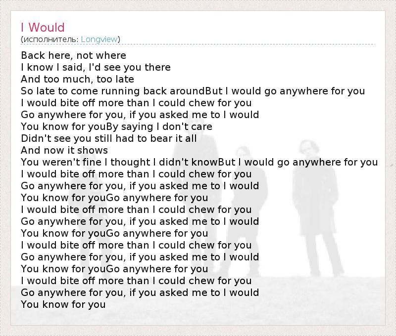 Back here, not where I know I said, I'd see you there And too much, too late So late to come running back aroundBut I would go anywhere for you I would bite off more than I could chew for you Go anywhere for you, if you asked me to I would You know for youBy saying I don't care Didn't see you still had to bear it all And now it shows You weren't fine I thought I didn't knowBut I would go anywhere for you I would bite off more than I could chew for you Go anywhere for you, if you asked me to I would You know for youGo anywhere for you I would bite off more than I could chew for you Go anywhere for you, if you asked me to I would You know for youGo anywhere for you I would bite off more than I could chew for you Go anywhere for you, if you asked me to I would You know for youGo anywhere for you I would bite off more than I could chew for you Go anywhere for you, if you asked me to I would You know for you