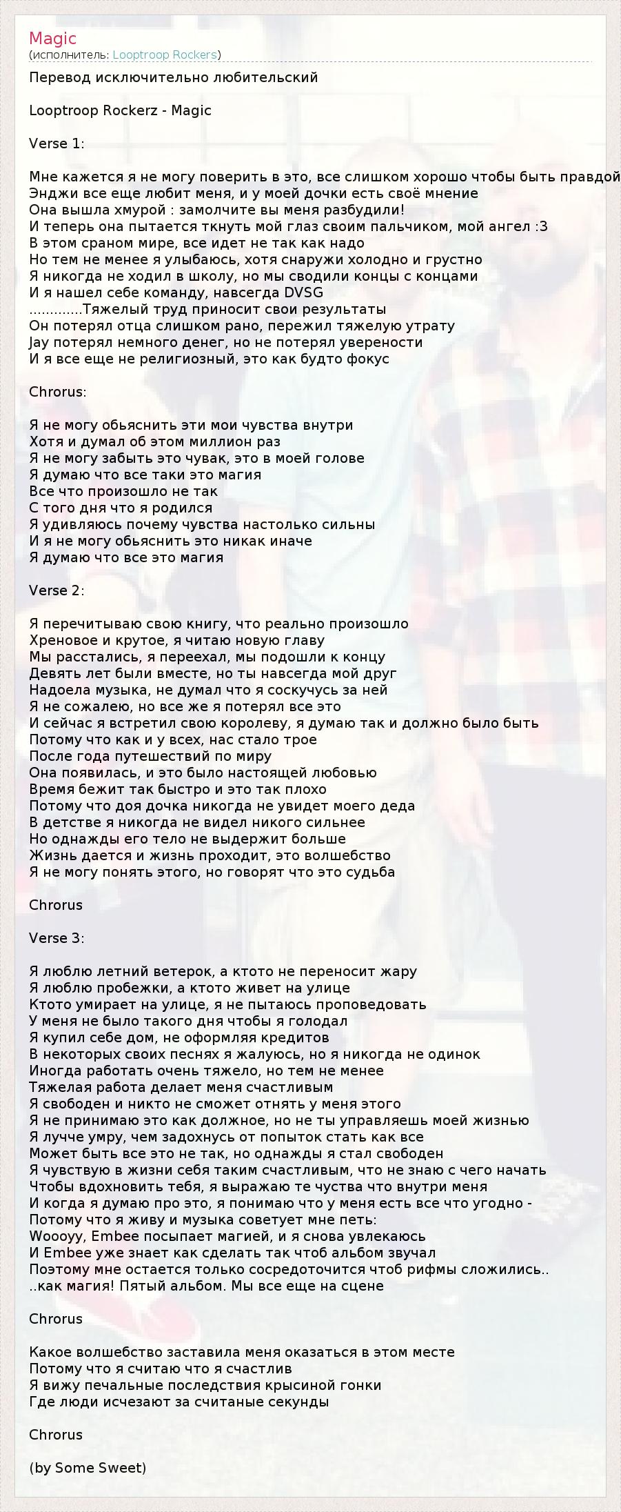 Перевод исключительно любительский Looptroop Rockerz - Magic Verse 1: Мне кажется я не могу поверить в это, все слишком хорошо чтобы быть правдой Энджи все еще любит меня, и у моей дочки есть своё мнение Она вышла хмурой : замолчите вы меня разбудили! И теперь она пытается ткнуть мой глаз своим пальчиком, мой ангел :3 В этом сраном мире, все идет не так как надо Но тем не менее я улыбаюсь, хотя снаружи холодно и грустно Я никогда не ходил в школу, но мы сводили концы с концами И я нашел себе команду, навсегда DVSG .............Тяжелый труд приносит свои результаты Он потерял отца слишком рано, пережил тяжелую утрату Jay потерял немного денег, но не потерял уверености И я все еще не религиозный, это как будто фокус Chrorus: Я не могу обьяснить эти мои чувства внутри Хотя и думал об этом миллион раз Я не могу забыть это чувак, это в моей голове Я думаю что все таки это магия Все что произошло не так С того дня что я родился Я удивляюсь почему чувства настолько сильны И я не могу обьяснить это никак иначе Я думаю что все это магия Verse 2: Я перечитываю свою книгу, что реально произошло Хреновое и крутое, я читаю новую главу Мы расстались, я переехал, мы подошли к концу Девять лет были вместе, но ты навсегда мой друг Надоела музыка, не думал что я соскучусь за ней Я не сожалею, но все же я потерял все это И сейчас я встретил свою королеву, я думаю так и должно было быть Потому что как и у всех, нас стало трое После года путешествий по миру Она появилась, и это было настоящей любовью Время бежит так быстро и это так плохо Потому что доя дочка никогда не увидет моего деда В детстве я никогда не видел никого сильнее Но однажды его тело не выдержит больше Жизнь дается и жизнь проходит, это волшебство Я не могу понять этого, но говорят что это судьба Chrorus Verse 3: Я люблю летний ветерок, а ктото не переносит жару Я люблю пробежки, а ктото живет на улице Ктото умирает на улице, я не пытаюсь проповедовать У меня не было такого дня чтобы я голодал Я купил себе дом, не оформляя кредитов В некоторых своих песнях я жалуюсь, но я никогда не одинок Иногда работать очень тяжело, но тем не менее Тяжелая работа делает меня счастливым Я свободен и никто не сможет отнять у меня этого Я не принимаю это как должное, но не ты управляешь моей жизнью Я лучче умру, чем задохнусь от попыток стать как все Может быть все это не так, но однажды я стал свободен Я чувствую в жизни себя таким счастливым, что не знаю с чего начать Чтобы вдохновить тебя, я выражаю те чуства что внутри меня И когда я думаю про это, я понимаю что у меня есть все что угодно - Потому что я живу и музыка советует мне петь: Woooyy, Embee посыпает магией, и я снова увлекаюсь И Embee уже знает как сделать так чтоб альбом звучал Поэтому мне остается только сосредоточится чтоб рифмы сложились.. ..как магия! Пятый альбом. Мы все еще на сцене Chrorus Какое волшебство заставила меня оказаться в этом месте Потому что я считаю что я счастлив Я вижу печальные последствия крысиной гонки Где люди исчезают за считаные секунды Chrorus (by Some Sweet)