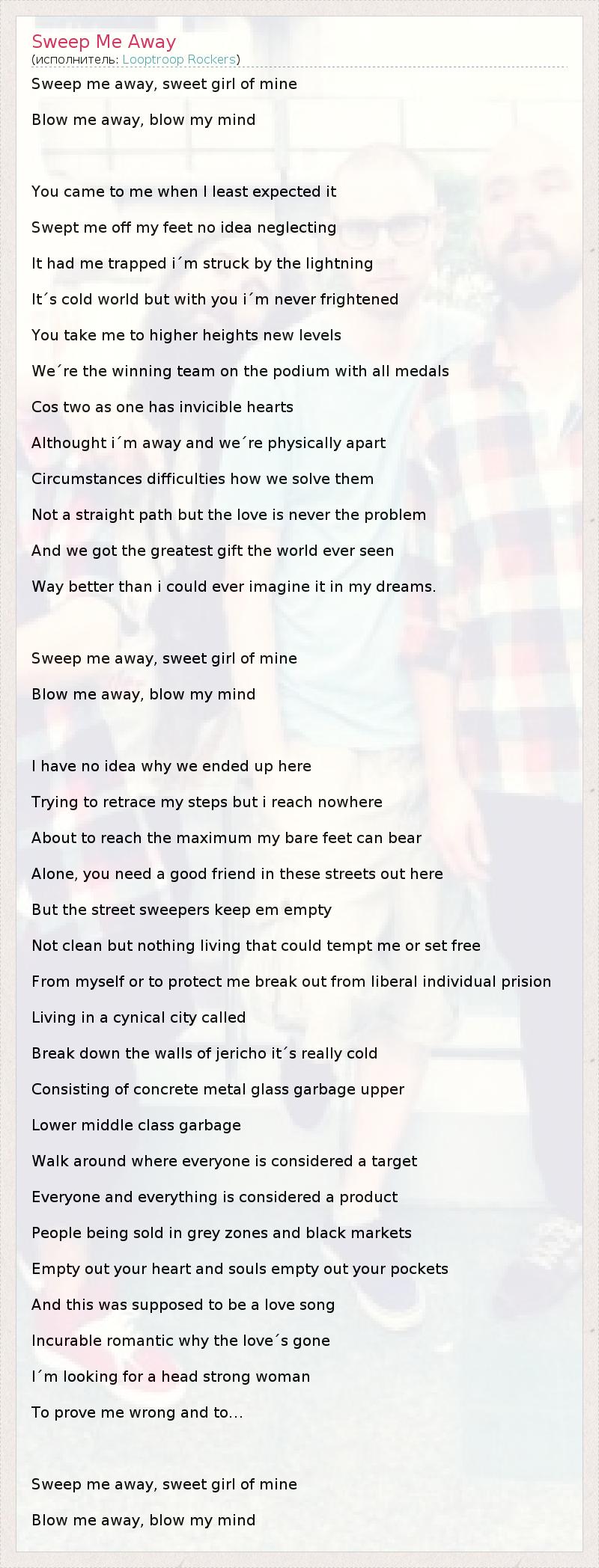 Sweep me away, sweet girl of mine Blow me away, blow my mind You came to me when I least expected it Swept me off my feet no idea neglecting It had me trapped i´m struck by the lightning It´s cold world but with you i´m never frightened You take me to higher heights new levels We´re the winning team on the podium with all medals Cos two as one has invicible hearts Althought i´m away and we´re physically apart Circumstances difficulties how we solve them Not a straight path but the love is never the problem And we got the greatest gift the world ever seen Way better than i could ever imagine it in my dreams. Sweep me away, sweet girl of mine Blow me away, blow my mind I have no idea why we ended up here Trying to retrace my steps but i reach nowhere About to reach the maximum my bare feet can bear Alone, you need a good friend in these streets out here But the street sweepers keep em empty Not clean but nothing living that could tempt me or set free From myself or to protect me break out from liberal individual prision Living in a cynical city called Break down the walls of jericho it´s really cold Consisting of concrete metal glass garbage upper Lower middle class garbage Walk around where everyone is considered a target Everyone and everything is considered a product People being sold in grey zones and black markets Empty out your heart and souls empty out your pockets And this was supposed to be a love song Incurable romantic why the love´s gone I´m looking for a head strong woman To prove me wrong and to… Sweep me away, sweet girl of mine Blow me away, blow my mind