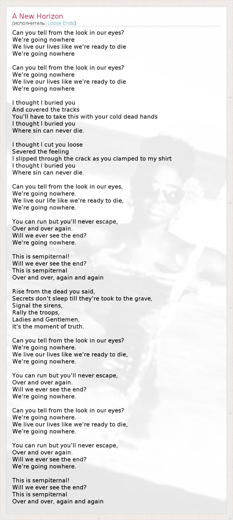 Видно ли по нашим глазам, Что мы идем в никуда? Живем так, словно готовы умереть, Мы идем в никуда. Видно ли по нашим глазам, Что мы идем в никуда? Живем так, словно готовы умереть, Мы идем в никуда. Я думал, что похоронил тебя И замел следы. Тебе придётся принять это, хоть ты уже мертва. 1 Я думал, что похоронил тебя, Где грех никогда не умрет. Я думал, что освободился от тебя, Избавился от чувств. Я провалился в трещину, когда ты цеплялась за мой рукав. Я думал, что похоронил тебя там, Где грех никогда не умрет. Видно ли по нашим глазам, Что мы идем в никуда? Живем так, словно готовы умереть, Мы идем в никуда. Ты можешь бежать, но тебе не вырваться, Снова и снова... Будет ли этому конец? Мы идем в никуда... Это бесконечно! Мы когда-нибудь увидим конец? Это бесконечно! Снова и снова, опять и опять... Восстав из мертвых, ты сказала: "Секреты не спят, пока их не унесут в могилу. Бейте тревогу, Созывайте войска! Леди и джентльмены, Настал момент истины!" Видно ли по нашим глазам, Что мы идем в никуда? Живем так, словно готовы умереть, Мы идем в никуда. Ты можешь бежать, но тебе не вырваться, Снова и снова... Будет ли этому конец? Мы идем в никуда... Видно ли по нашим глазам, Что мы идем в никуда? Живем так, словно готовы умереть, Мы идем в никуда. Ты можешь бежать, но тебе не вырваться, Снова и снова... Будет ли этому конец? Мы идем в никуда... Это бесконечно! Мы когда-нибудь увидим конец? Это бесконечно! Снова и снова, опять и опять... 1 - дословно: тебе придётся взять это своими ледяными как у мертвеца руками