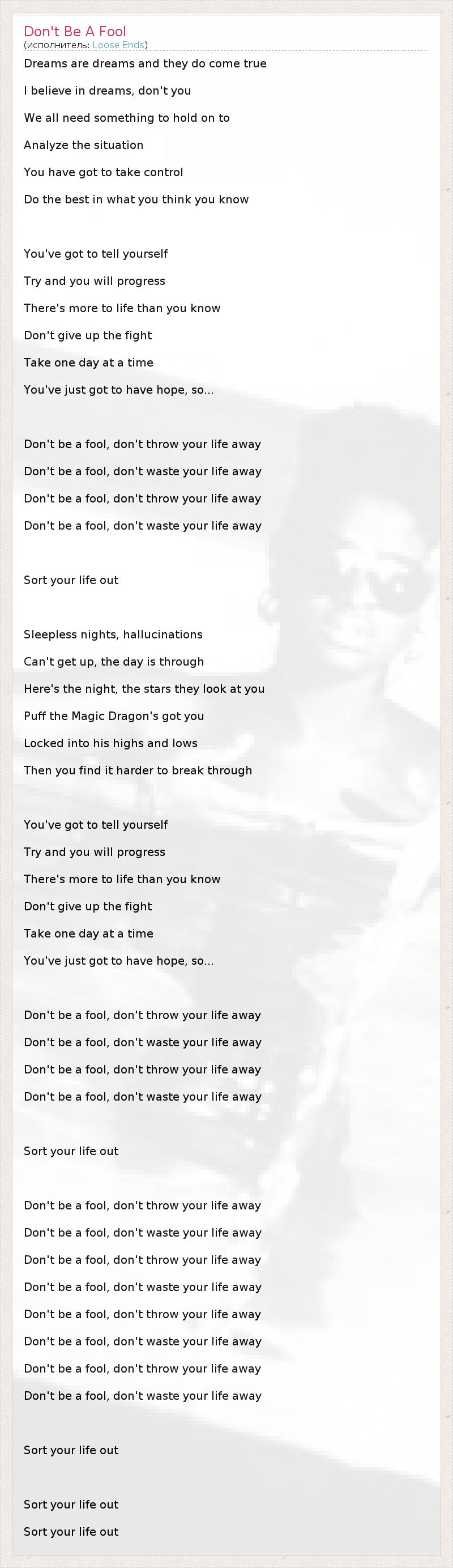 Dreams are dreams and they do come true I believe in dreams, don't you We all need something to hold on to Analyze the situation You have got to take control Do the best in what you think you know You've got to tell yourself Try and you will progress There's more to life than you know Don't give up the fight Take one day at a time You've just got to have hope, so... Don't be a fool, don't throw your life away Don't be a fool, don't waste your life away Don't be a fool, don't throw your life away Don't be a fool, don't waste your life away Sort your life out Sleepless nights, hallucinations Can't get up, the day is through Here's the night, the stars they look at you Puff the Magic Dragon's got you Locked into his highs and lows Then you find it harder to break through You've got to tell yourself Try and you will progress There's more to life than you know Don't give up the fight Take one day at a time You've just got to have hope, so... Don't be a fool, don't throw your life away Don't be a fool, don't waste your life away Don't be a fool, don't throw your life away Don't be a fool, don't waste your life away Sort your life out Don't be a fool, don't throw your life away Don't be a fool, don't waste your life away Don't be a fool, don't throw your life away Don't be a fool, don't waste your life away Don't be a fool, don't throw your life away Don't be a fool, don't waste your life away Don't be a fool, don't throw your life away Don't be a fool, don't waste your life away Sort your life out Sort your life out Sort your life out