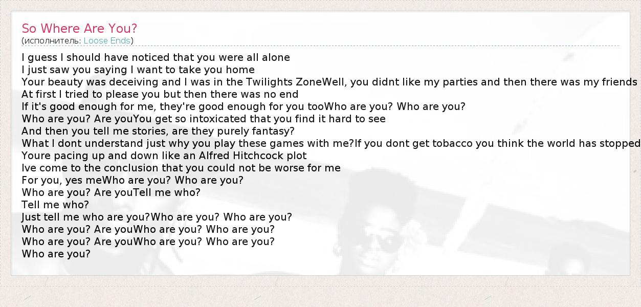 I guess I should have noticed that you were all alone I just saw you saying I want to take you home Your beauty was deceiving and I was in the Twilights ZoneWell, you didnt like my parties and then there was my friends At first I tried to please you but then there was no end If it's good enough for me, they're good enough for you tooWho are you? Who are you? Who are you? Are youYou get so intoxicated that you find it hard to see And then you tell me stories, are they purely fantasy? What I dont understand just why you play these games with me?If you dont get tobacco you think the world has stopped Youre pacing up and down like an Alfred Hitchcock plot Ive come to the conclusion that you could not be worse for me For you, yes meWho are you? Who are you? Who are you? Are youTell me who? Tell me who? Just tell me who are you?Who are you? Who are you? Who are you? Are youWho are you? Who are you? Who are you? Are youWho are you? Who are you? Who are you?