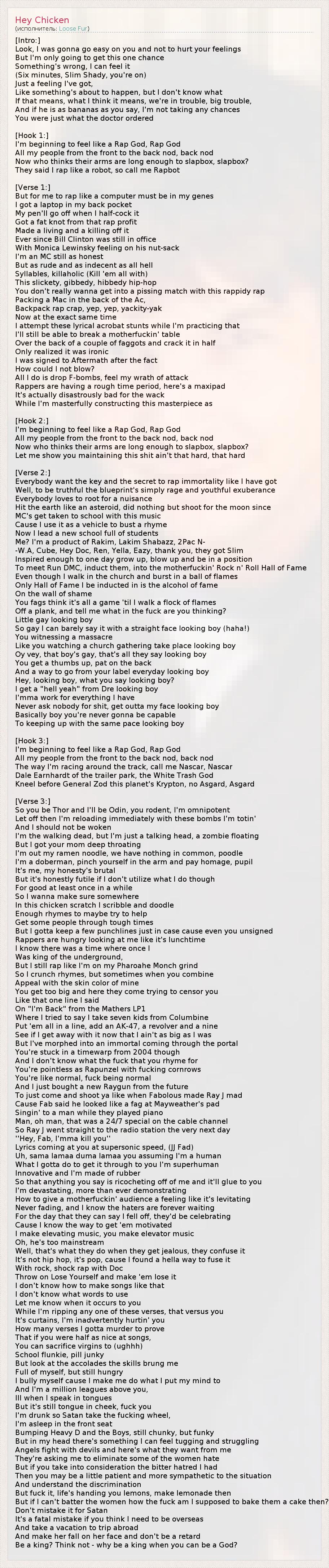 [Intro:] Look, I was gonna go easy on you and not to hurt your feelings But I'm only going to get this one chance Something's wrong, I can feel it (Six minutes, Slim Shady, you're on) Just a feeling I've got, Like something's about to happen, but I don't know what If that means, what I think it means, we're in trouble, big trouble, And if he is as bananas as you say, I'm not taking any chances You were just what the doctor ordered [Hook 1:] I'm beginning to feel like a Rap God, Rap God All my people from the front to the back nod, back nod Now who thinks their arms are long enough to slapbox, slapbox? They said I rap like a robot, so call me Rapbot [Verse 1:] But for me to rap like a computer must be in my genes I got a laptop in my back pocket My pen'll go off when I half-cock it Got a fat knot from that rap profit Made a living and a killing off it Ever since Bill Clinton was still in office With Monica Lewinsky feeling on his nut-sack I'm an MC still as honest But as rude and as indecent as all hell Syllables, killaholic (Kill 'em all with) This slickety, gibbedy, hibbedy hip-hop You don't really wanna get into a pissing match with this rappidy rap Packing a Mac in the back of the Ac, Backpack rap crap, yep, yep, yackity-yak Now at the exact same time I attempt these lyrical acrobat stunts while I'm practicing that I'll still be able to break a motherfuckin' table Over the back of a couple of faggots and crack it in half Only realized it was ironic I was signed to Aftermath after the fact How could I not blow? All I do is drop F-bombs, feel my wrath of attack Rappers are having a rough time period, here's a maxipad It's actually disastrously bad for the wack While I'm masterfully constructing this masterpiece as [Hook 2:] I'm beginning to feel like a Rap God, Rap God All my people from the front to the back nod, back nod Now who thinks their arms are long enough to slapbox, slapbox? Let me show you maintaining this shit ain't that hard, that hard [Verse 2:] Everybody want the key and the secret to rap immortality like I have got Well, to be truthful the blueprint's simply rage and youthful exuberance Everybody loves to root for a nuisance Hit the earth like an asteroid, did nothing but shoot for the moon since MC's get taken to school with this music Cause I use it as a vehicle to bust a rhyme Now I lead a new school full of students Me? I'm a product of Rakim, Lakim Shabazz, 2Pac N- -W.A, Cube, Hey Doc, Ren, Yella, Eazy, thank you, they got Slim Inspired enough to one day grow up, blow up and be in a position To meet Run DMC, induct them, into the motherfuckin' Rock n' Roll Hall of Fame Even though I walk in the church and burst in a ball of flames Only Hall of Fame I be inducted in is the alcohol of fame On the wall of shame You fags think it's all a game 'til I walk a flock of flames Off a plank, and tell me what in the fuck are you thinking? Little gay looking boy So gay I can barely say it with a straight face looking boy (haha!) You witnessing a massacre Like you watching a church gathering take place looking boy Oy vey, that boy's gay, that's all they say looking boy You get a thumbs up, pat on the back And a way to go from your label everyday looking boy Hey, looking boy, what you say looking boy? I get a "hell yeah" from Dre looking boy I'mma work for everything I have Never ask nobody for shit, get outta my face looking boy Basically boy you're never gonna be capable To keeping up with the same pace looking boy [Hook 3:] I'm beginning to feel like a Rap God, Rap God All my people from the front to the back nod, back nod The way I'm racing around the track, call me Nascar, Nascar Dale Earnhardt of the trailer park, the White Trash God Kneel before General Zod this planet's Krypton, no Asgard, Asgard [Verse 3:] So you be Thor and I'll be Odin, you rodent, I'm omnipotent Let off then I'm reloading immediately with these bombs I'm totin' And I should not be woken I'm the walking dead, but I'm just a talking head, a zombie floating But I got your mom deep throating I'm out my ramen noodle, we have nothing in common, poodle I'm a doberman, pinch yourself in the arm and pay homage, pupil It's me, my honesty's brutal But it's honestly futile if I don't utilize what I do though For good at least once in a while So I wanna make sure somewhere In this chicken scratch I scribble and doodle Enough rhymes to maybe try to help Get some people through tough times But I gotta keep a few punchlines just in case cause even you unsigned Rappers are hungry looking at me like it's lunchtime I know there was a time where once I Was king of the underground, But I still rap like I'm on my Pharoahe Monch grind So I crunch rhymes, but sometimes when you combine Appeal with the skin color of mine You get too big and here they come trying to censor you Like that one line I said On "I'm Back" from the Mathers LP1 Where I tried to say I take seven kids from Columbine Put 'em all in a line, add an AK-47, a revolver and a nine See if I get away with it now that I ain't as big as I was But I've morphed into an immortal coming through the portal You're stuck in a timewarp from 2004 though And I don't know what the fuck that you rhyme for You're pointless as Rapunzel with fucking cornrows You're like normal, fuck being normal And I just bought a new Raygun from the future To just come and shoot ya like when Fabolous made Ray J mad Cause Fab said he looked like a fag at Mayweather's pad Singin' to a man while they played piano Man, oh man, that was a 24/7 special on the cable channel So Ray J went straight to the radio station the very next day ''Hey, Fab, I'mma kill you'' Lyrics coming at you at supersonic speed, (JJ Fad) Uh, sama lamaa duma lamaa you assuming I'm a human What I gotta do to get it through to you I'm superhuman Innovative and I'm made of rubber So that anything you say is ricocheting off of me and it'll glue to you I'm devastating, more than ever demonstrating How to give a motherfuckin' audien