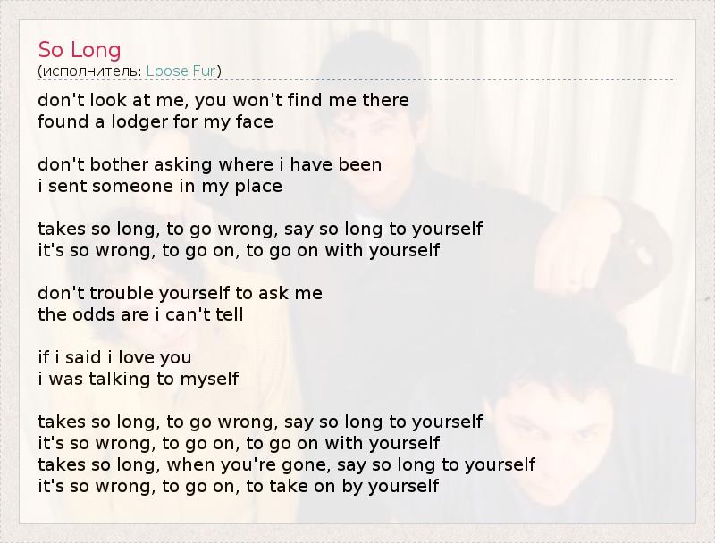 don't look at me, you won't find me there found a lodger for my face don't bother asking where i have been i sent someone in my place takes so long, to go wrong, say so long to yourself it's so wrong, to go on, to go on with yourself don't trouble yourself to ask me the odds are i can't tell if i said i love you i was talking to myself takes so long, to go wrong, say so long to yourself it's so wrong, to go on, to go on with yourself takes so long, when you're gone, say so long to yourself it's so wrong, to go on, to take on by yourself