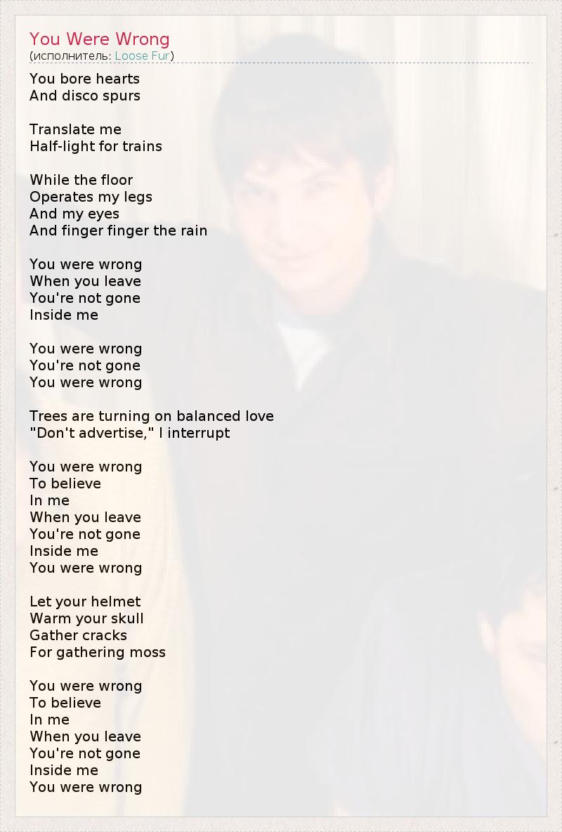You bore hearts And disco spurs Translate me Half-light for trains While the floor Operates my legs And my eyes And finger finger the rain You were wrong When you leave You're not gone Inside me You were wrong You're not gone You were wrong Trees are turning on balanced love "Don't advertise," I interrupt You were wrong To believe In me When you leave You're not gone Inside me You were wrong Let your helmet Warm your skull Gather cracks For gathering moss You were wrong To believe In me When you leave You're not gone Inside me You were wrong