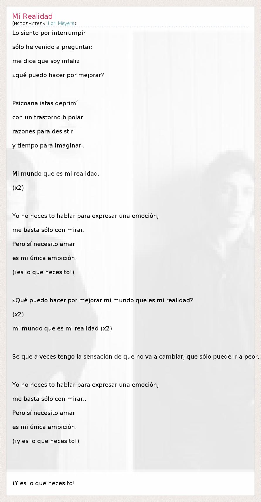 Lo siento por interrumpir sólo he venido a preguntar: me dice que soy infeliz ¿qué puedo hacer por mejorar? Psicoanalistas deprimí con un trastorno bipolar razones para desistir y tiempo para imaginar.. Mi mundo que es mi realidad. (x2) Yo no necesito hablar para expresar una emoción, me basta sólo con mirar. Pero sí necesito amar es mi única ambición. (¡es lo que necesito!) ¿Qué puedo hacer por mejorar mi mundo que es mi realidad? (x2) mi mundo que es mi realidad (x2) Se que a veces tengo la sensación de que no va a cambiar, que sólo puede ir a peor.. Yo no necesito hablar para expresar una emoción, me basta sólo con mirar.. Pero sí necesito amar es mi única ambición. (¡y es lo que necesito!) ¡Y es lo que necesito!