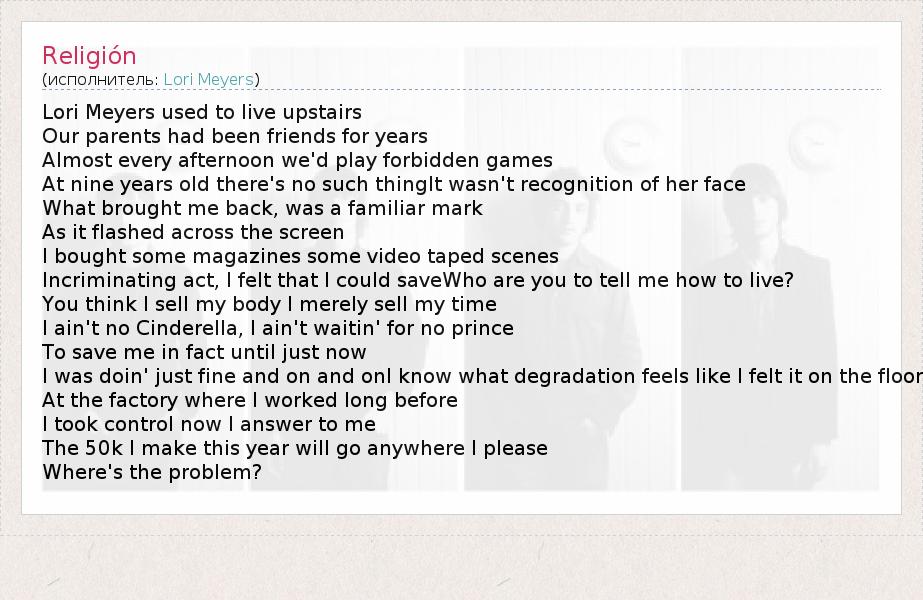 Lori Meyers used to live upstairs Our parents had been friends for years Almost every afternoon we'd play forbidden games At nine years old there's no such thingIt wasn't recognition of her face What brought me back, was a familiar mark As it flashed across the screen I bought some magazines some video taped scenes Incriminating act, I felt that I could saveWho are you to tell me how to live? You think I sell my body I merely sell my time I ain't no Cinderella, I ain't waitin' for no prince To save me in fact until just now I was doin' just fine and on and onI know what degradation feels like I felt it on the floor At the factory where I worked long before I took control now I answer to me The 50k I make this year will go anywhere I please Where's the problem?