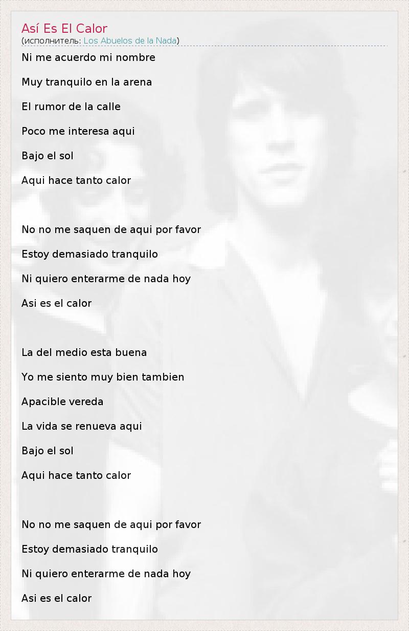 Ni me acuerdo mi nombre Muy tranquilo en la arena El rumor de la calle Poco me interesa aqui Bajo el sol Aqui hace tanto calor No no me saquen de aqui por favor Estoy demasiado tranquilo Ni quiero enterarme de nada hoy Asi es el calor La del medio esta buena Yo me siento muy bien tambien Apacible vereda La vida se renueva aqui Bajo el sol Aqui hace tanto calor No no me saquen de aqui por favor Estoy demasiado tranquilo Ni quiero enterarme de nada hoy Asi es el calor