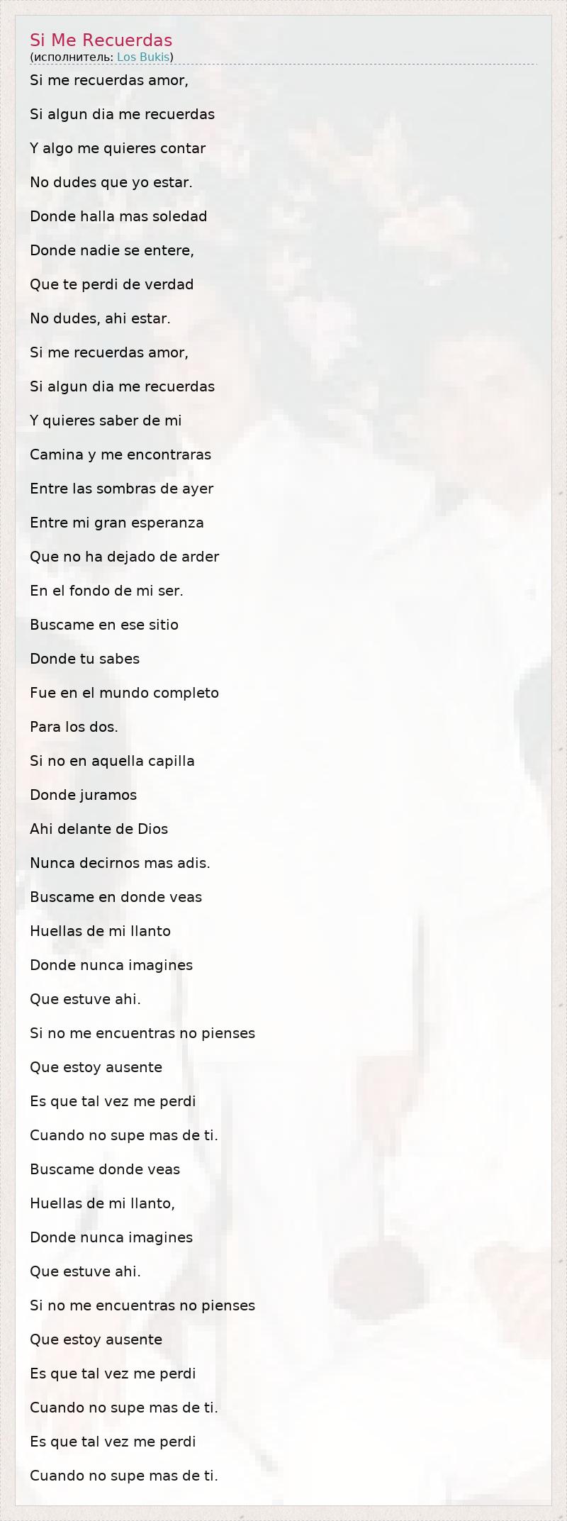 Si me recuerdas amor, Si algun dia me recuerdas Y algo me quieres contar No dudes que yo estar. Donde halla mas soledad Donde nadie se entere, Que te perdi de verdad No dudes, ahi estar. Si me recuerdas amor, Si algun dia me recuerdas Y quieres saber de mi Camina y me encontraras Entre las sombras de ayer Entre mi gran esperanza Que no ha dejado de arder En el fondo de mi ser. Buscame en ese sitio Donde tu sabes Fue en el mundo completo Para los dos. Si no en aquella capilla Donde juramos Ahi delante de Dios Nunca decirnos mas adis. Buscame en donde veas Huellas de mi llanto Donde nunca imagines Que estuve ahi. Si no me encuentras no pienses Que estoy ausente Es que tal vez me perdi Cuando no supe mas de ti. Buscame donde veas Huellas de mi llanto, Donde nunca imagines Que estuve ahi. Si no me encuentras no pienses Que estoy ausente Es que tal vez me perdi Cuando no supe mas de ti. Es que tal vez me perdi Cuando no supe mas de ti.